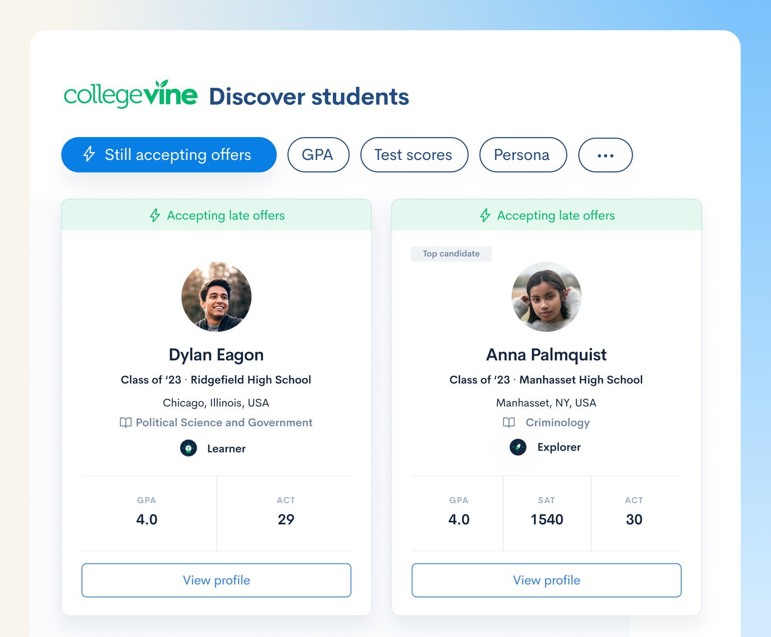 - Seniors can opt-in to displaying a “Still Accepting Offers” badge on their CollegeVine profile, similar to LinkedIn’s “Open to Work” system