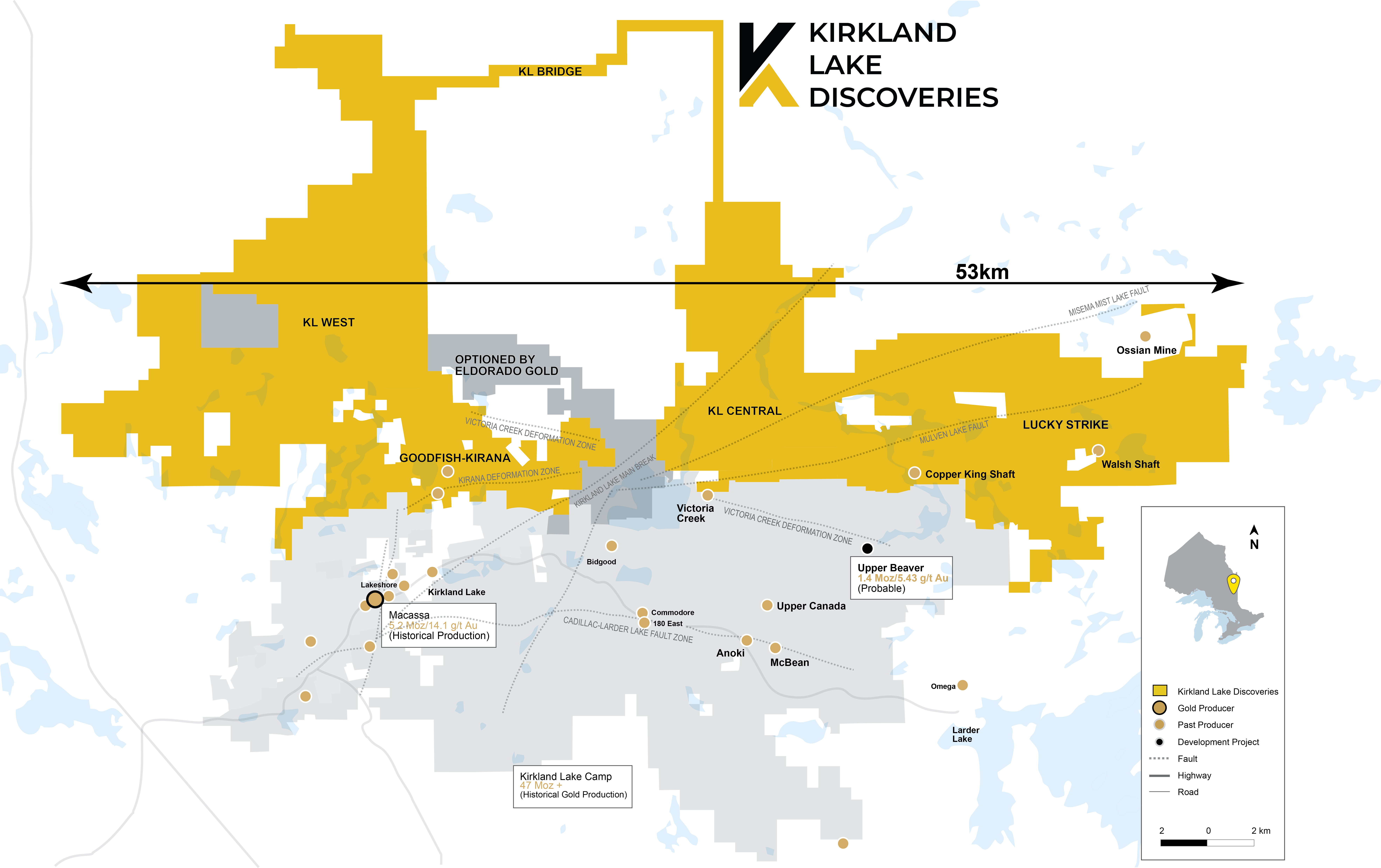 The properties assembled include the 100%-owned Lucky Strike Property, Goodfish-Kirana, the Arnold property, and the optioned KL West (KLW) and KL Central (KLC) properties. The KLDC land position comprises approximately 38,000 ha, over 1,338 claims and 29 patented claims and ranks the Company as the largest landholder in the Kirkland Lake region.