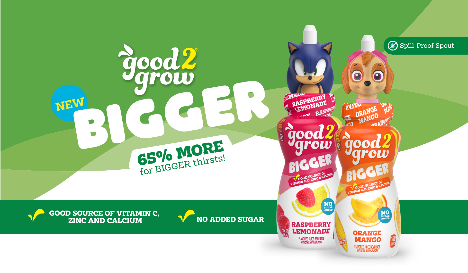 “We know that parents are bombarded with options when it comes to choosing beverages and snacks for their kids, so we strive to make good2grow an easy decision,” said Gunnar Olson, CEO. “All of our products – including new BIGGER – not only answer parents’ desires for convenience and nutrition, but also make kids smile with delicious flavors and character tops.”