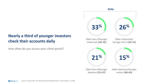 WESTON, Mass.--(BUSINESS WIRE)--Seven in 10 clients of financial advisors (69%) report spending more time checking their accounts online today than they did two years ago, according to findings from Advisor360°’s latest survey. In addition, while 74 percent of respondents check their portfolios through their advisor’s client portal at least weekly, 33 percent of Generation Z and young millennials are in their accounts daily, more than any other generation surveyed.