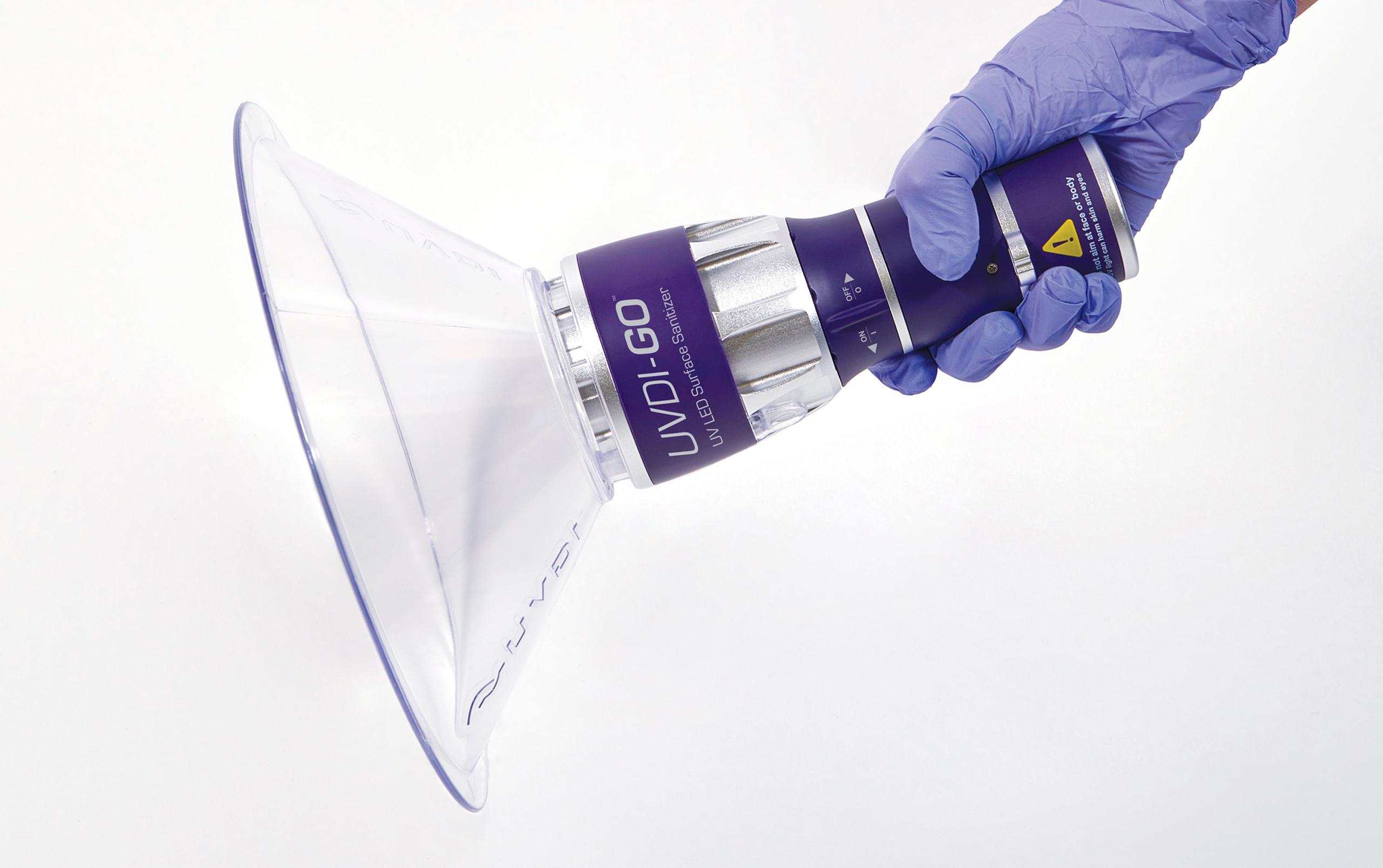 UVDI-GO™には、照射中の紫外線曝露から使用者を守る、取り外し簡単な保護コーンが付いています。医療従事者は保護ゴーグルと手袋を着けた状態で、手持ちサイズの同製品を安全に利用することができます。