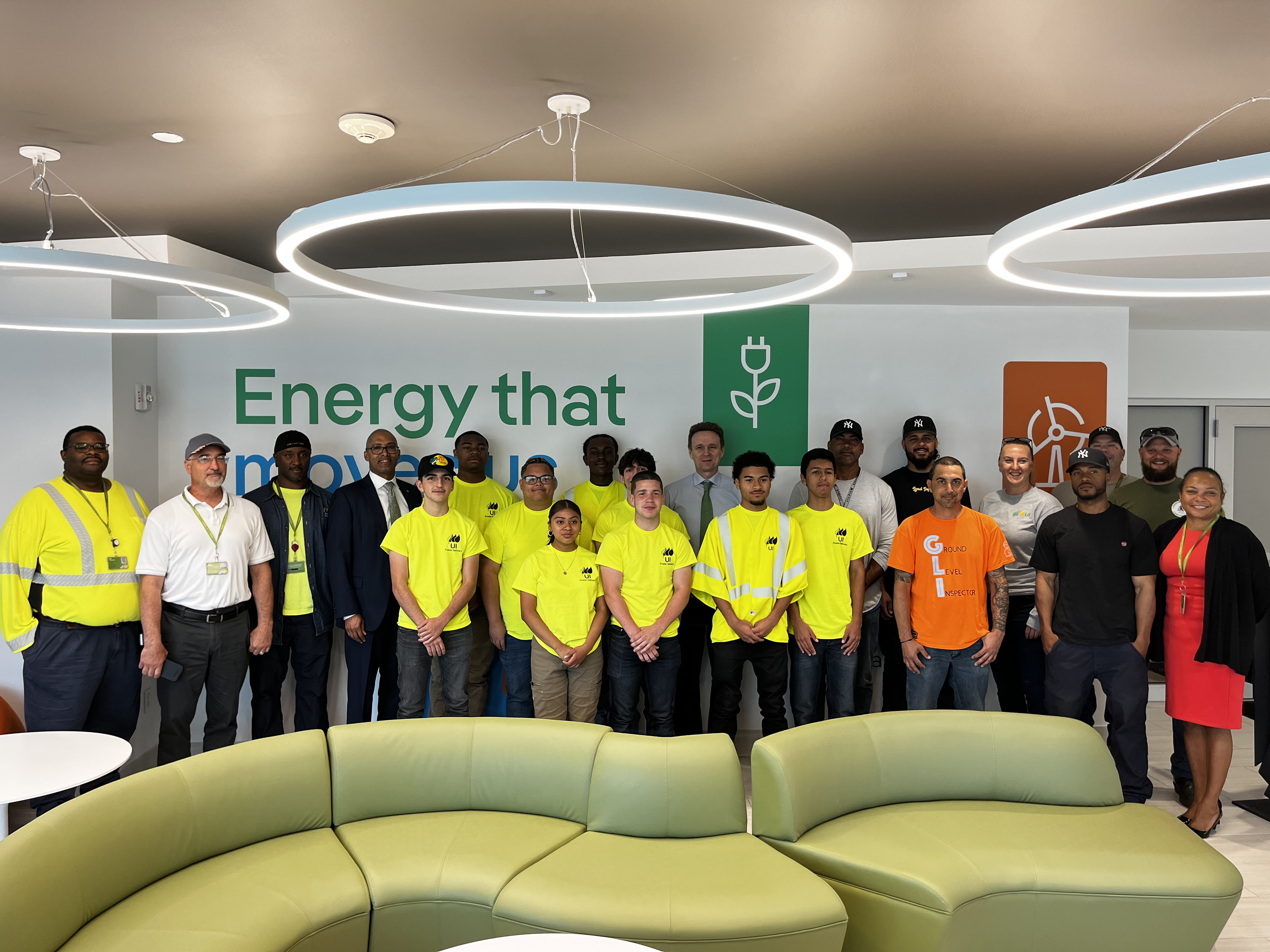 The Union Scholars (middle in yellow shirts) joined Avangrid CEO Pedro Azagra, UI President & CEO Frank Reynolds, UWUA Local 470-1 President Moses Rams, Avangrid SVP/CHRO Kyra Patterson, Senior Manager of Regional Operations Christine Pariseau, and members of the UI team at the Union Scholars Program launch.