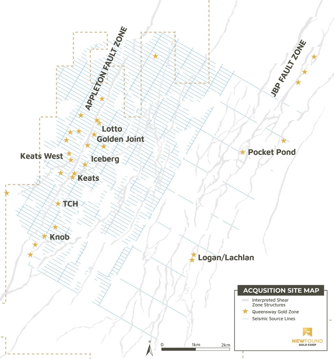 VANCOUVER, British Columbia--(BUSINESS WIRE)--New Found Gold Corp. (“New Found” or the “Company”) (TSX-V: NFG, NYSE-A: NFGC) is pleased to provide an update on its industry-leading 3-D seismic survey that will cover 47 km2 along the Appleton (“AFZ”) and JBP Fault Zones (“JBPFZ”) at its Queensway Project. New Found’s 100%-owned Queensway Project comprises a 1,662km2 area, accessible via the Trans-Canada Highway, 15km west of Gander, Newfoundland and Labrador.