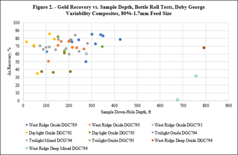 Gold recoveries obtained from the West Ridge Oxide samples from drill holes DGC789, 790 and 791 ranged from 50.0% to 85.4% and averaged 71.4%. Only 4 of the 28 composites gave gold recoveries below 65%. A single West Ridge-Deep oxide composite (hole DGC796) was tested. Gold recovery from that composite (68.2%) was comparable to the other oxide composites. [The two mixed composites from the same drill hole gave low recoveries.]