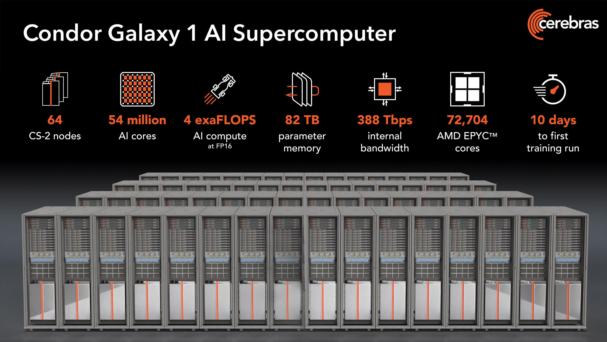 CG-1 is de eerste van drie AI-supercomputers (CG-1, CG-2 en CG-3) van 4 exaFLOP's, gebouwd en gevestigd in de VS via het samenwerkingsverband van Cerebras en G42. Deze drie AI-supercomputers zullen onderling worden verbonden in een gedistribueerde AI-supercomputer van 12 exaFLOP's en 162 miljoen kernen, bestaande uit 192 Cerebras CS-2's en gevoed door meer dan 218.000 krachtige AMD EPYC CPU-kernen. G42 en Cerebras zijn van plan om in 2024 zes extra Condor Galaxy-supercomputers online te brengen, waardoor het totale rekenvermogen op 36 exaFLOP's komt.