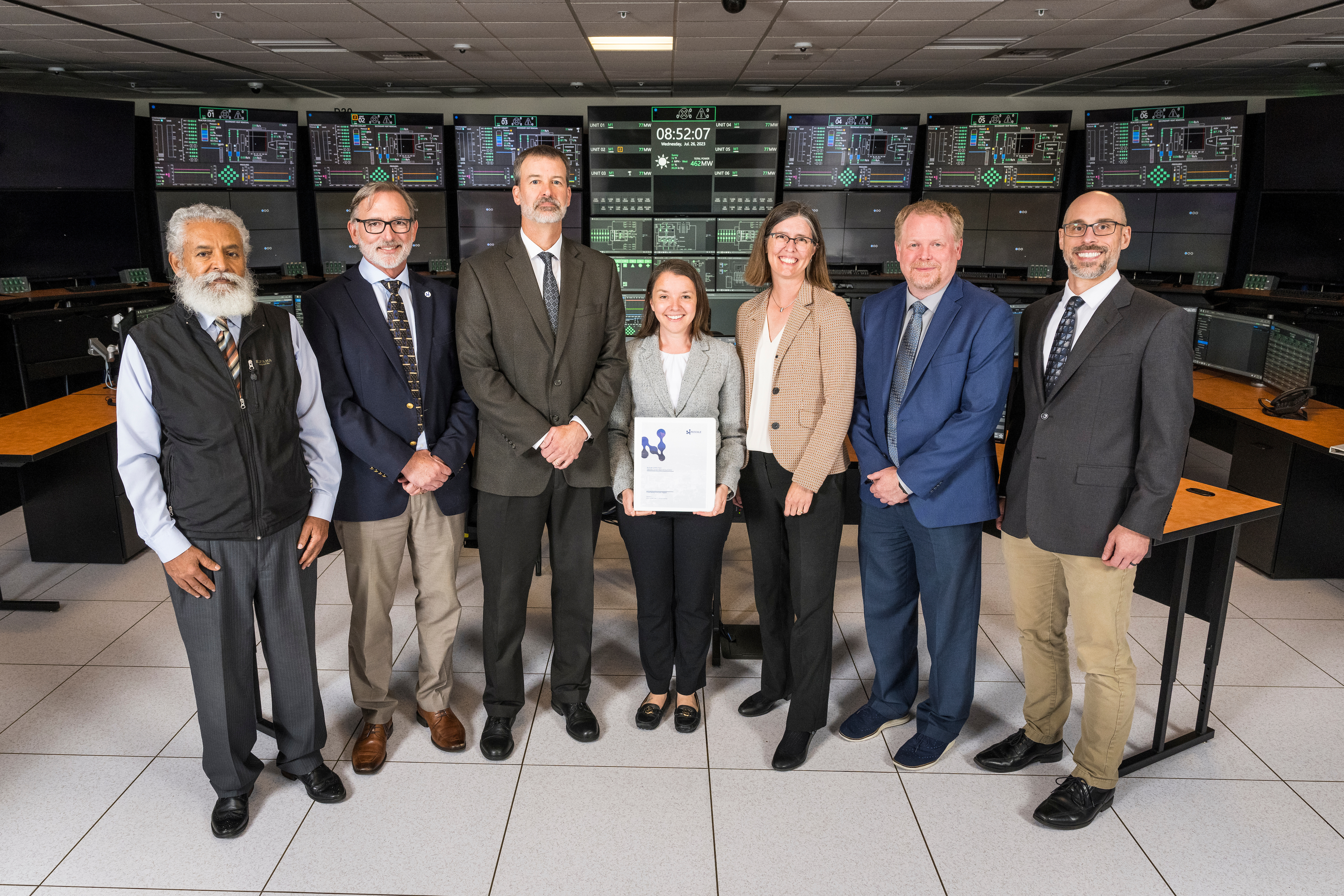 Left to right: Getachew Tesfaye, U.S. Nuclear Regulatory Commission; Senior Project Manager; Robert Gamble, NuScale Power Vice President of Engineering; Brian Smith, U.S. Nuclear Regulatory Commission Director of the Division of New and Renewed Licenses; Carrie Fosaaen, NuScale Power Vice President of Regulatory Affairs; Karin Feldman, NuScale Power Vice President of Program Management Office; Robert Taylor, U.S. Nuclear Regulatory Commission Deputy Office Director for New Reactors; and Mark Shaver, NuScale Power Director of Regulatory Affairs marked the U.S. Nuclear Regulatory Commission’s acceptance of NuScale’s Standard Design Approval Application for formal review. (Photo: Business Wire)