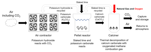 La tecnología que utilizará 1PointFive fue desarrollada por Carbon Engineering of Canada, que absorbe CO2 del aire con una solución de hidróxido de potasio (KOH).