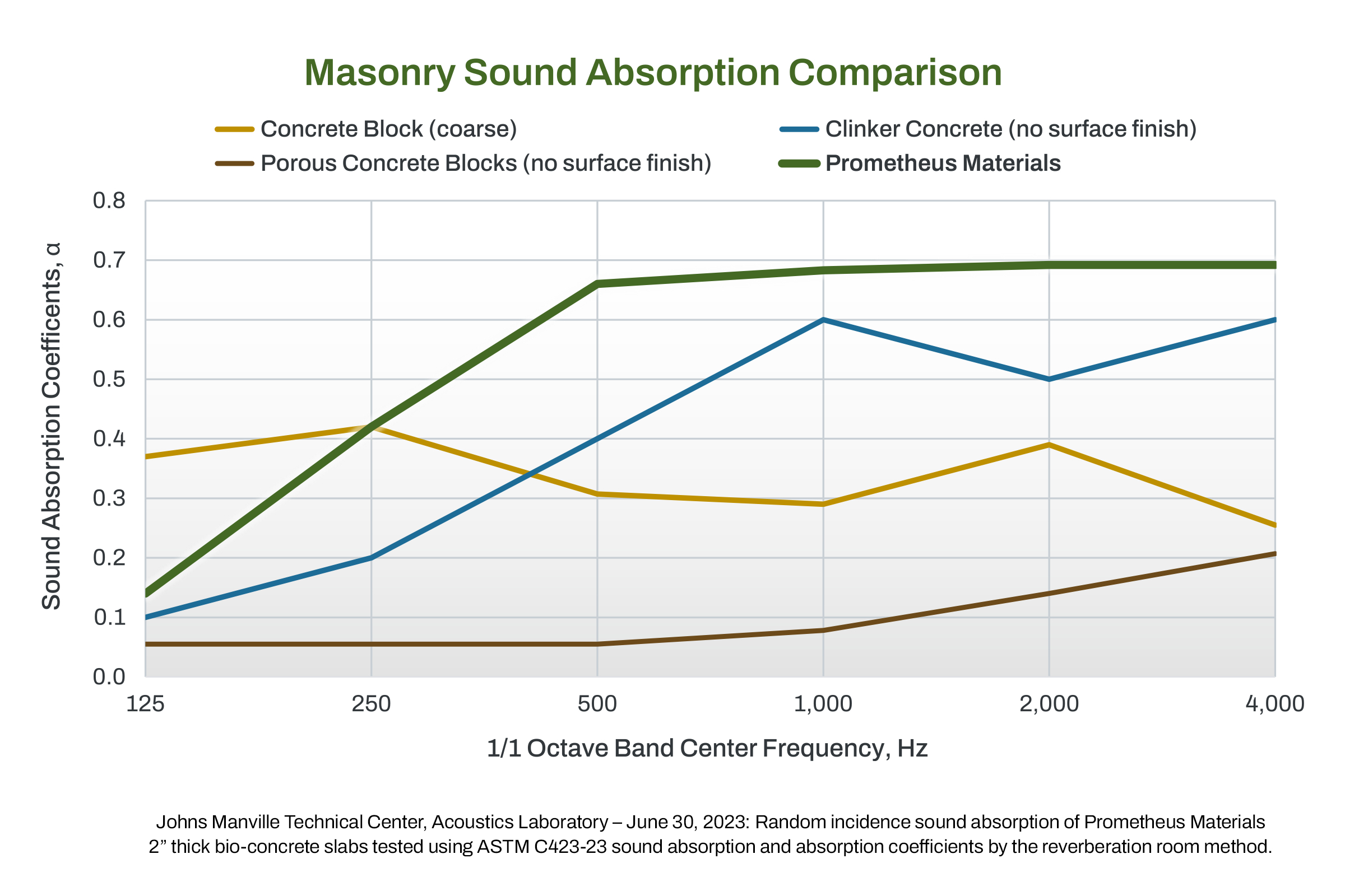 Il Johns Manville Technical Center in Littleton, in Colorado (un centro di ricerca e sviluppo di primo livello), ha condotto dei test indipendenti, riscontrando come il bio-cemento e bio-calcestruzzo di Prometheus Materials hanno dimostrato una coefficiente di riduzione del suono (NRC) pari a 0.60.
