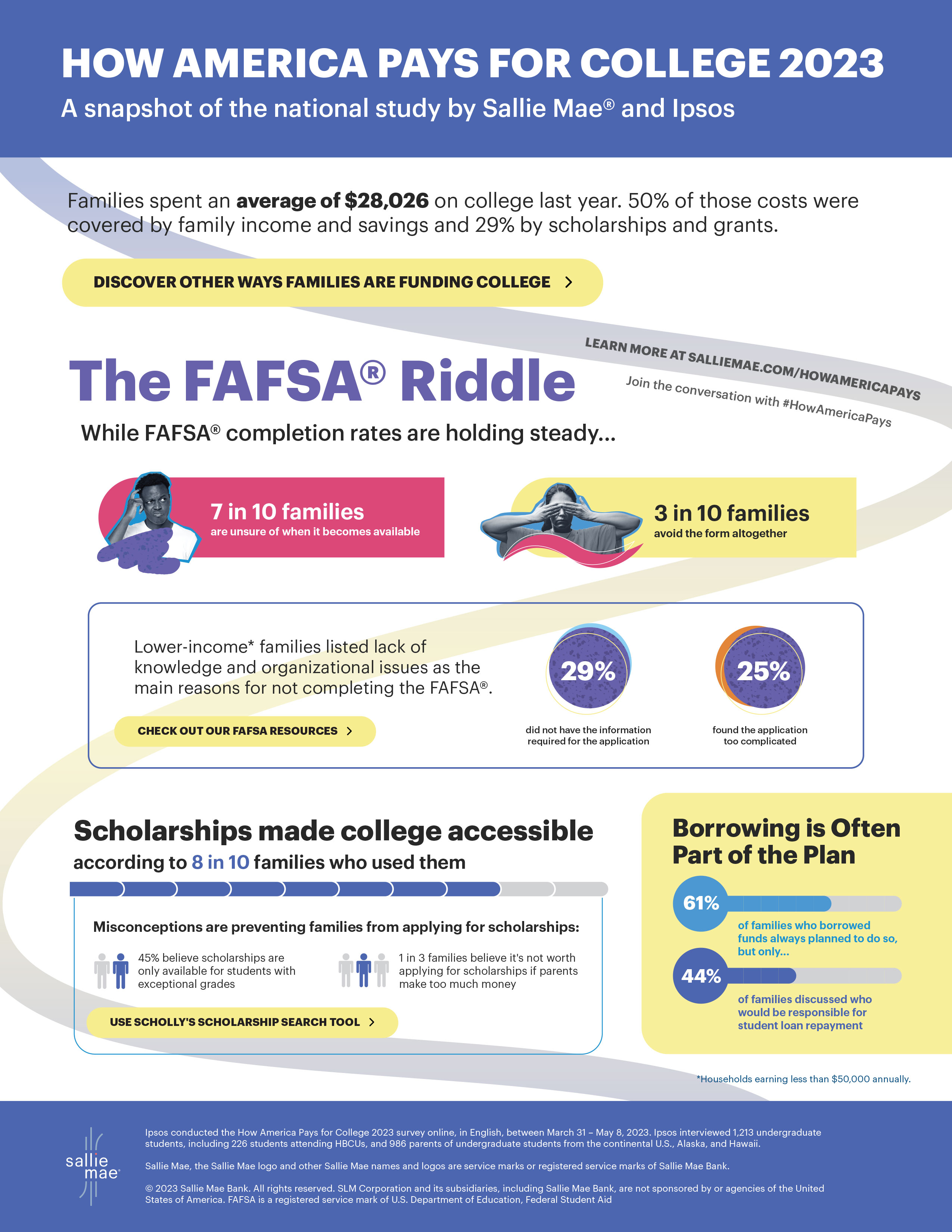 NEWARK, Del.--(BUSINESS WIRE)--Families reported spending $28,026 on college for academic year 2022-23—an 11% increase from $25,313 in 2021-22— and covered half of expenses with income and savings, according to new data in How America Pays For College 2023,” the annual study from Sallie Mae® and Ipsos. Scholarships and grants were used by 76% of families and covered 29% of costs, and 41% of families reported borrowing for college, covering 19% of costs.