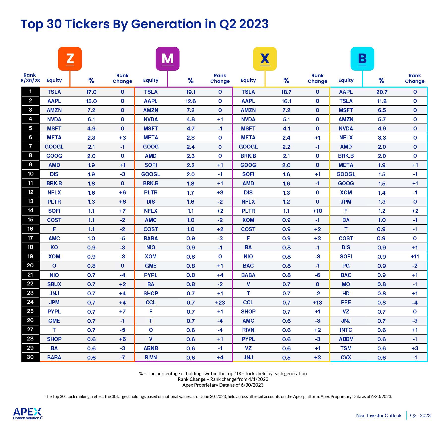 The following data refers to the rankings of the most commonly held securities at Apex by generation in Q2 2023. The data shows a given ticker’s movement within this ranking system among a particular generation. These observations are for informational purposes about generational trends and are not investment advice. Key report findings include:
