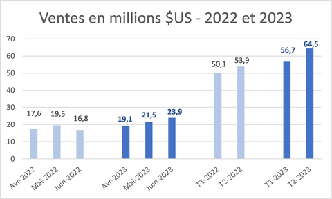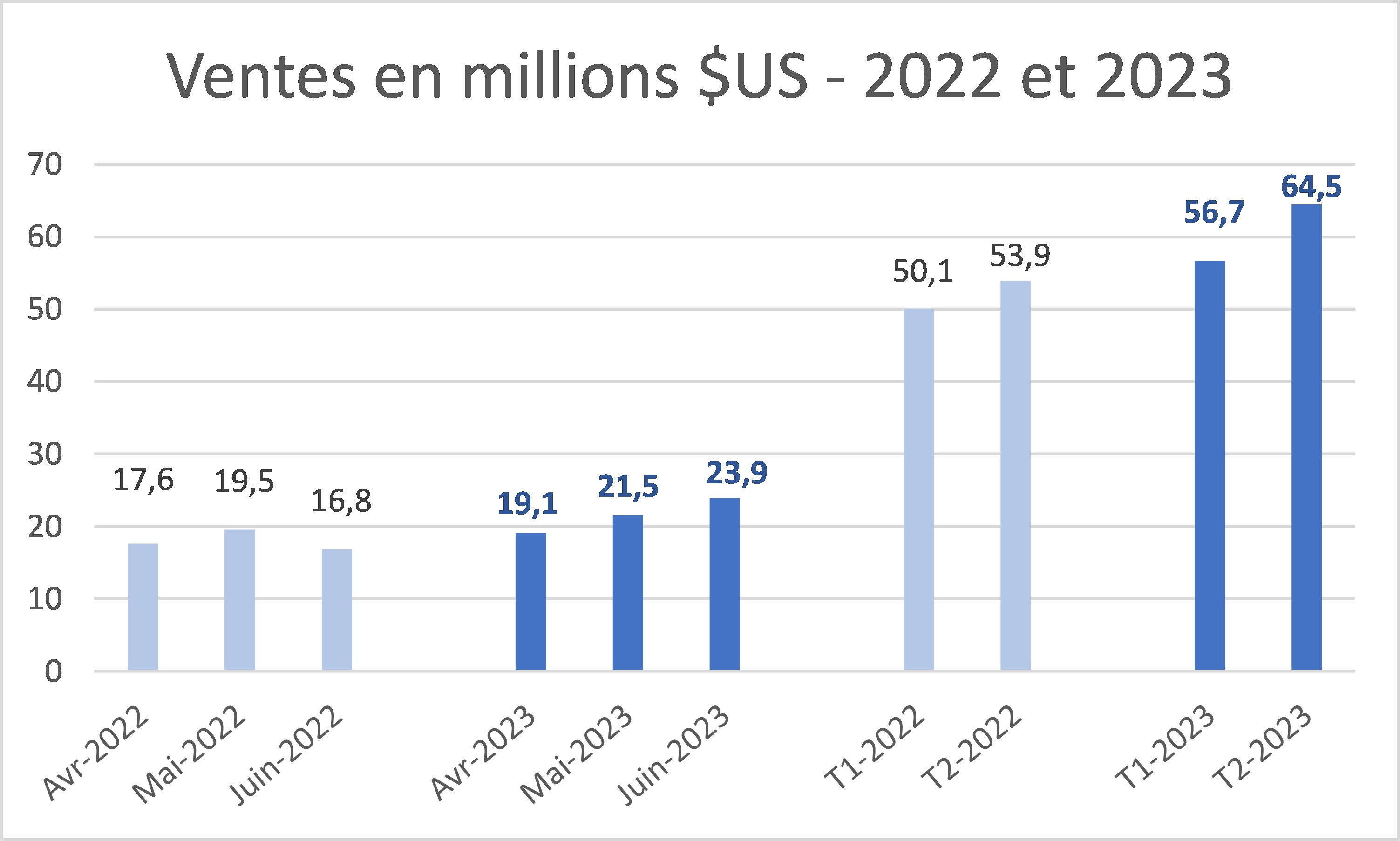 - Augmentation des ventes de 19,7%. Avec des volumes et un prix de vente moyen plus élevés, les ventes se sont élevées à 64,5 millions $ en T2-2023 comparativement à 53,9 millions $ en T2-2022 ;