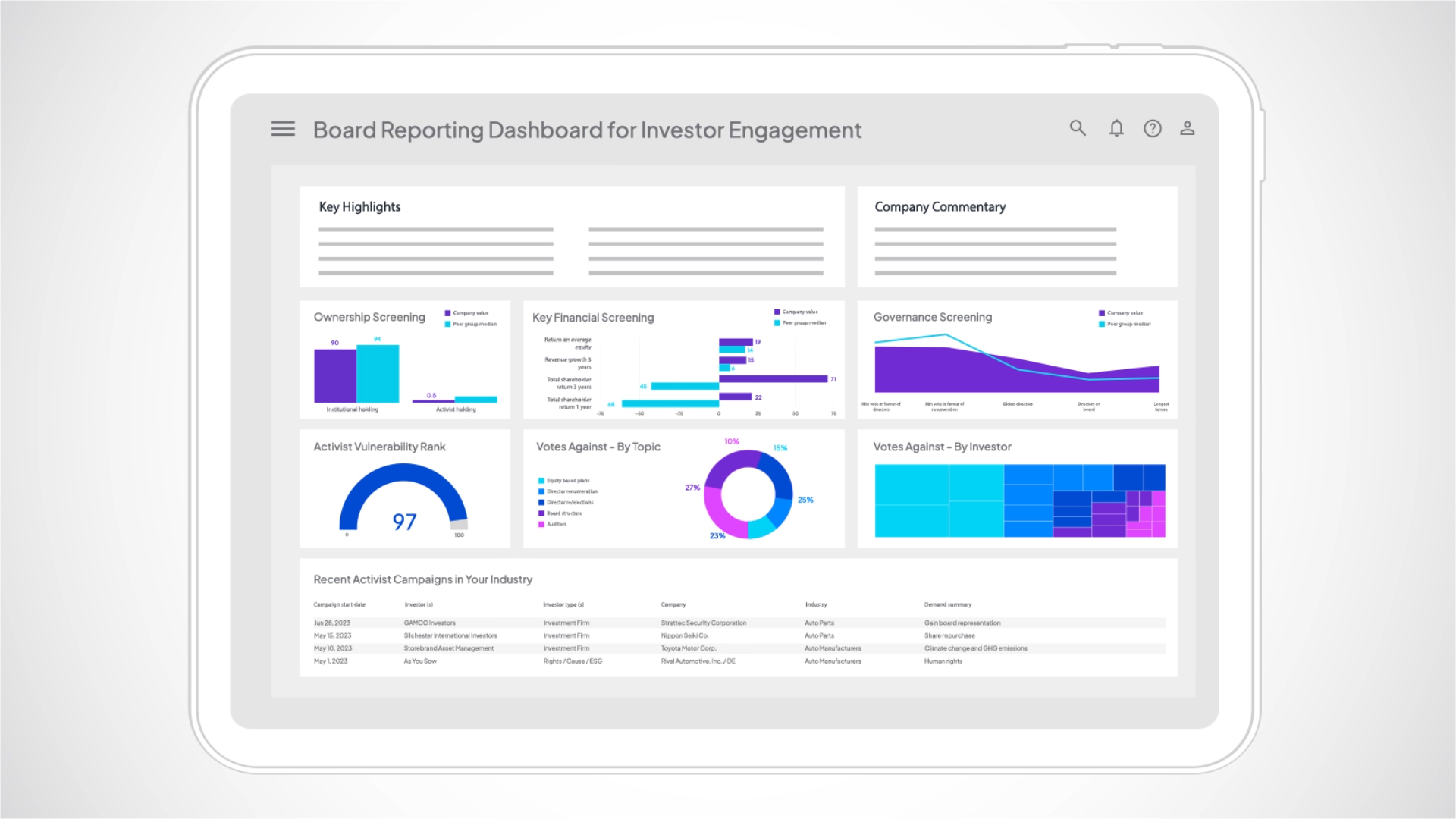 Board Reporting for Investor Engagement equips the board and leadership team with the right insights on who an organization’s investors are, the issues they care most about, and how their organizations benchmark against peers — all within the industry’s leading board portal, Diligent Boards.