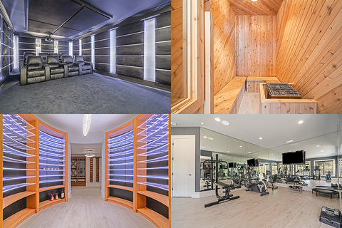 To be sure, the luxe home is loaded with features, including lofted, two-story ceilings with oversized windows throughout the main living level, two gourmet kitchens, an elevator, and a finished lower level with a fitness center, sauna, recording studio, home theater, wine room with illuminated shelving and separate tasting area, and billiards/gaming areas.