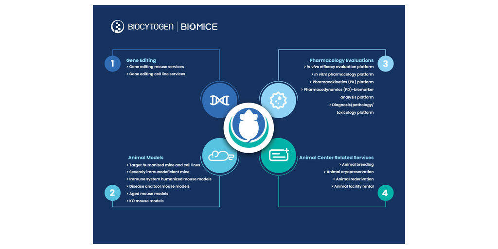 バイオサイトジェンの前臨床プラットフォームには、カスタマイズした遺伝子編集サービス、既製のヒト化または免疫不全(あるいはその両方)動物と細胞モデル製品の作製、前臨床薬理学サービスが含まれます。これらの革新的な製品とサービスにより、新規の抗ヒト治療薬、特にバイオ医薬品の効率的な評価が可能となります。バイオサイトジェンは事業ラインをよりうまくアピールし、前臨床モデルとサービスのブランドイメージを高めるため、これらの主要プラットフォームをサブブランド「BioMice™」として統合します。ヒト化動物モデルの生産におけるリーダー企業の1社として前臨床モデルとサービス部門に代わるサブブランド、BioMiceを確立することにより、バイオ医薬品を創薬する過程で同社の動物モデル製品が果たす中心的な役割について、世界の認知度を高めます。