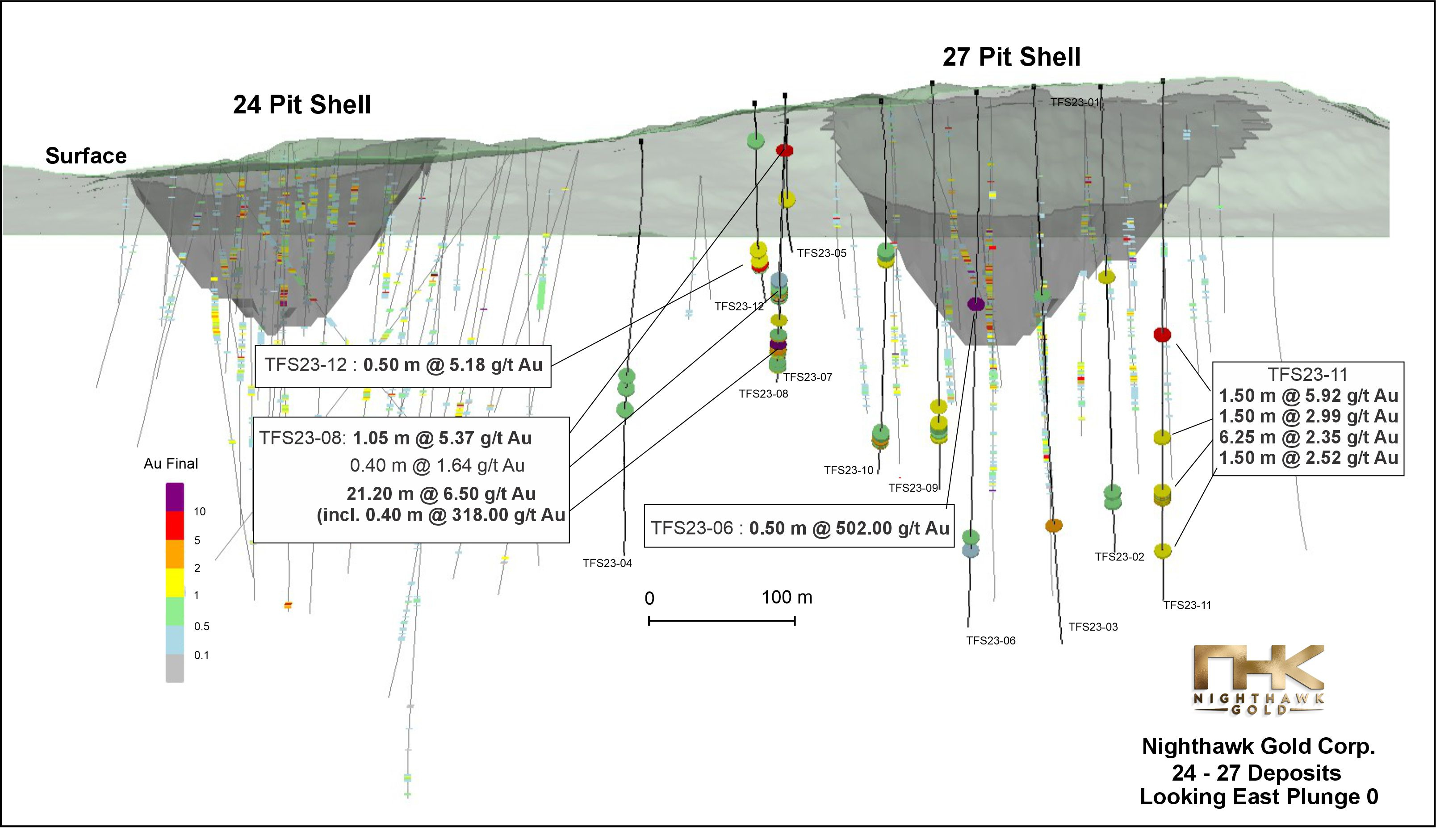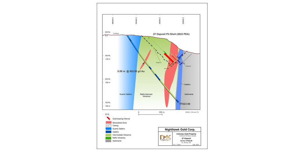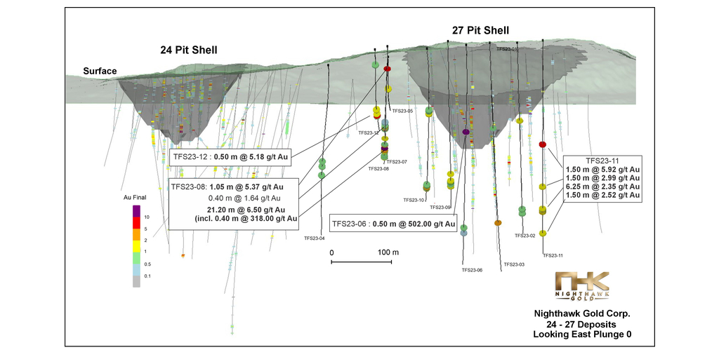 Nighthawk Gold Intersects 16.14 oz/t Au (502 g/t Au) over 0.50 m and 10.22 oz/t Au (318 g/t Au) over 0.40 m at the 24/27 Deposit