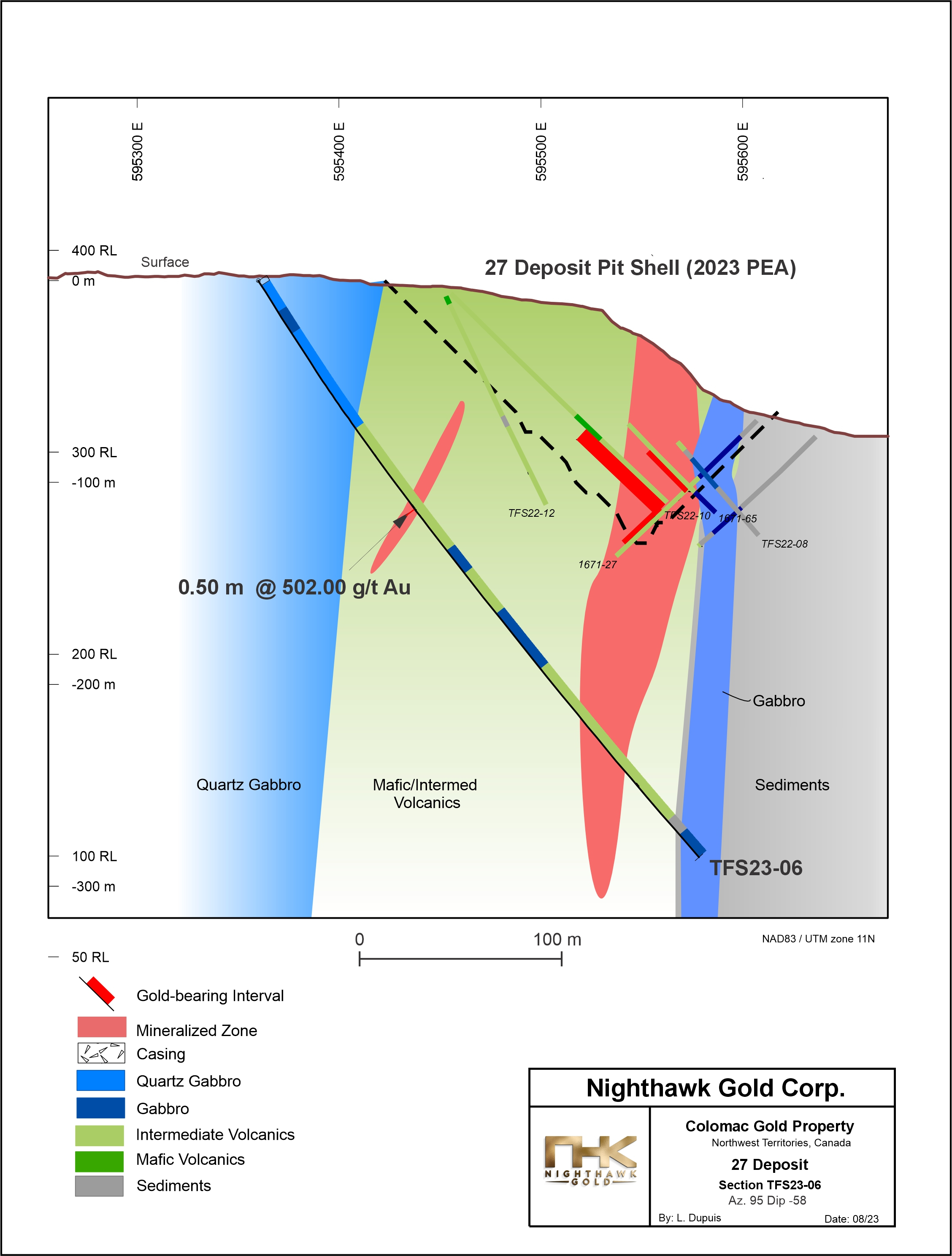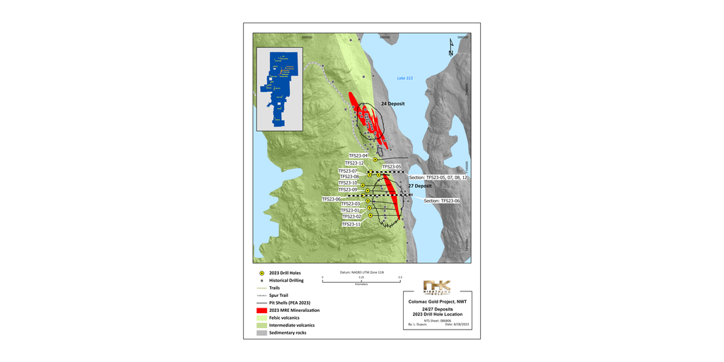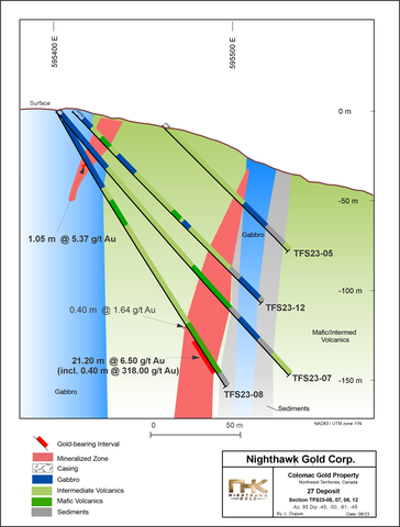 The 2023 drilling focused on the strike and depth extensions of the deposit, particularly in areas outside and in between the two pit-shells (as estimated in the Colomac Gold Project PEA1). The Company intersected significant high-grade gold mineralization in hole TFS23-06 just below and to the west of the 27 deposit pit-shell (see Figures 1, 2 and 5) and TFS23-08 along strike to the north of the 27 deposit pit-shell (see Figures 1, 3 and 6). The intercept expanded gold mineralization into the untested areas, potentially expanding the 27 deposit pit-shell and reducing the mineralization gap between the 24 and 27 deposit pit-shells. Coarse gold samples were intersected in 9 of the 12 drill holes.