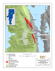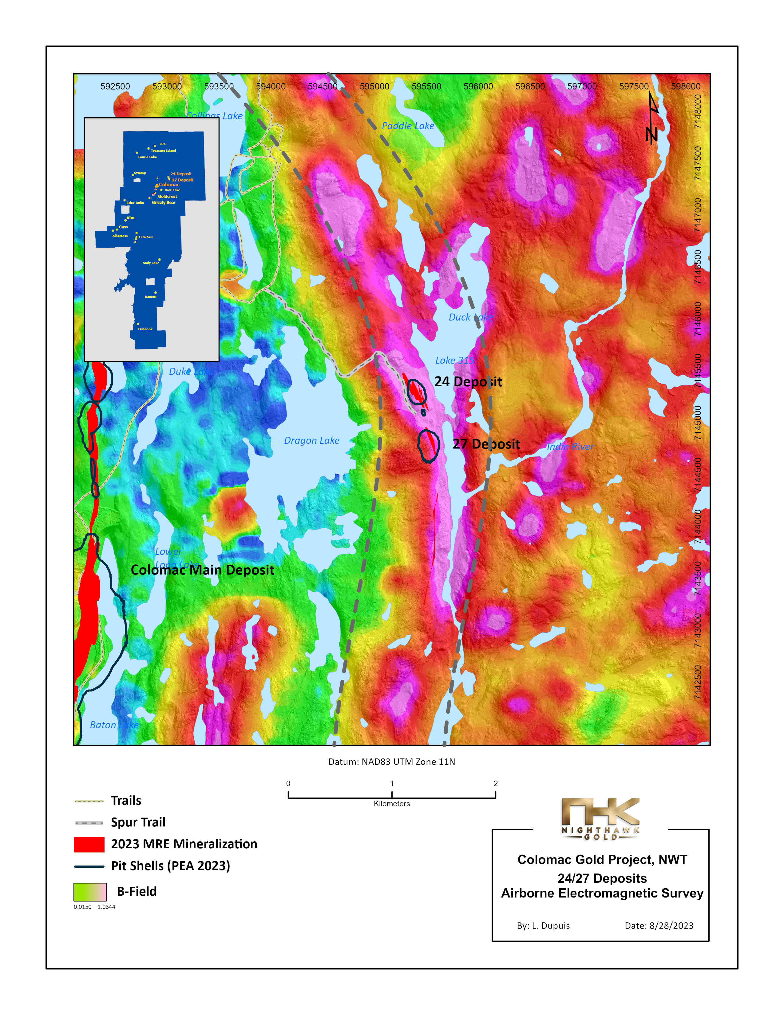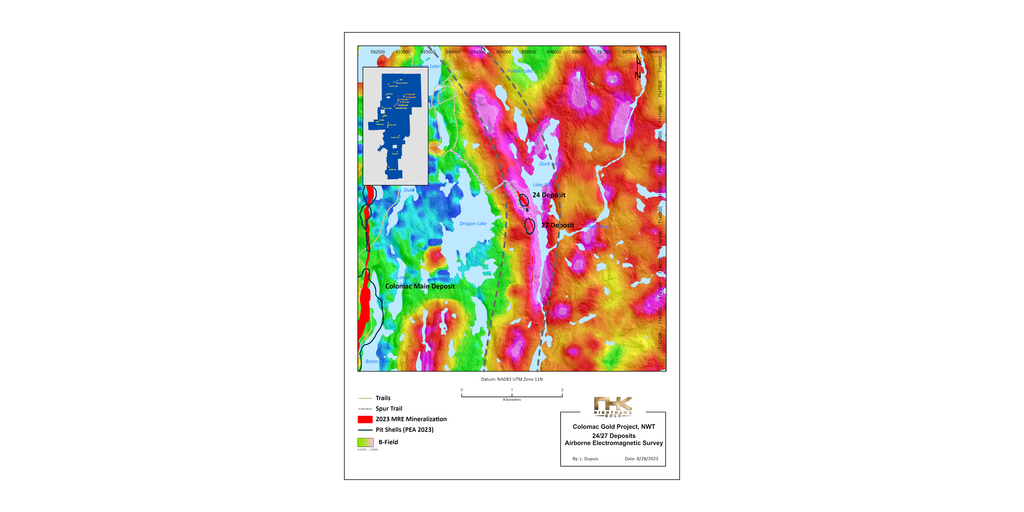 The 24/27 Deposit is in the Colomac Centre Area and located 2 km northeast of the Colomac Main Deposit. The 24/27 Deposit represents two zones of near-surface, gold mineralization about 250 m apart. See Figure 4 for the 24/27 Deposit local map of the drilling. Mineralization at the 24/27 Deposit is hosted by grey-white smoky quartz veins in volcanic rocks along the geological contact with sedimentary rocks to the east. The contact is highlighted by a prominent electromagnetic anomaly. The combination of geophysics and geology will be utilized to generate new exploration targets along the underexplored 12 km contact (See Figure 7 for the 24/27 Deposit Electromagnetic Survey Map).