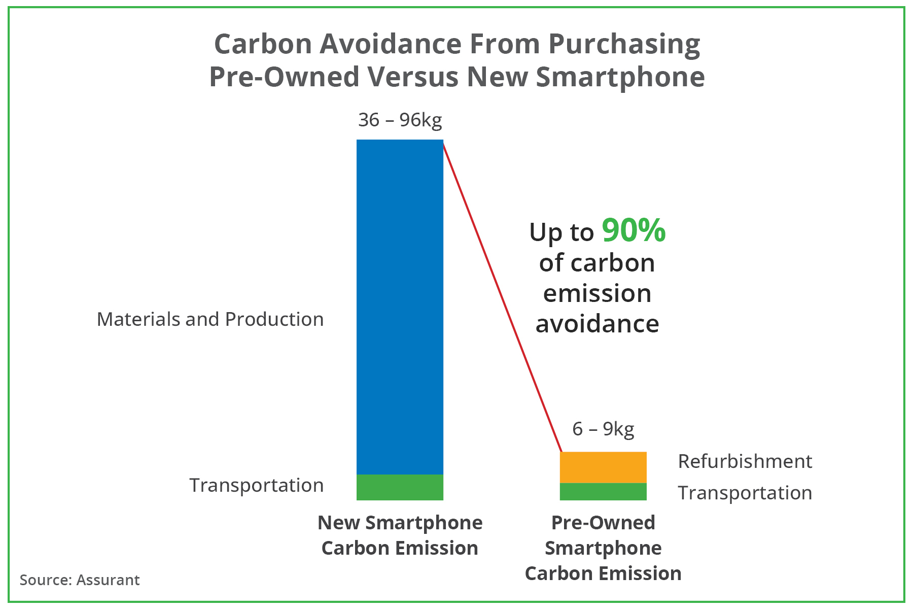 ATLANTA--(BUSINESS WIRE)--Assurant, Inc. (NYSE: AIZ), a leading global business services company that supports, protects, and connects major consumer purchases, today introduced Carbon IQ™, the first solution that provides detailed measurement and insights on the carbon impact of individual connected devices, including refurbished devices, throughout the device lifecycle. Based on Carbon IQ insights, a new smartphone has an estimated carbon footprint that ranges from 36 kg to 96 kg of CO2 while a refurbished device has up to 90 percent fewer emissions.