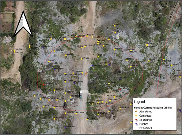 The team has drilled some confirmation holes in the East 400 area. East 400 is the smallest and shallowest of the planned pits at the Kombat mine. The following holes have dramatically extended the known mineralization and mineable tonnage in the zone. The following are a couple of the best results: