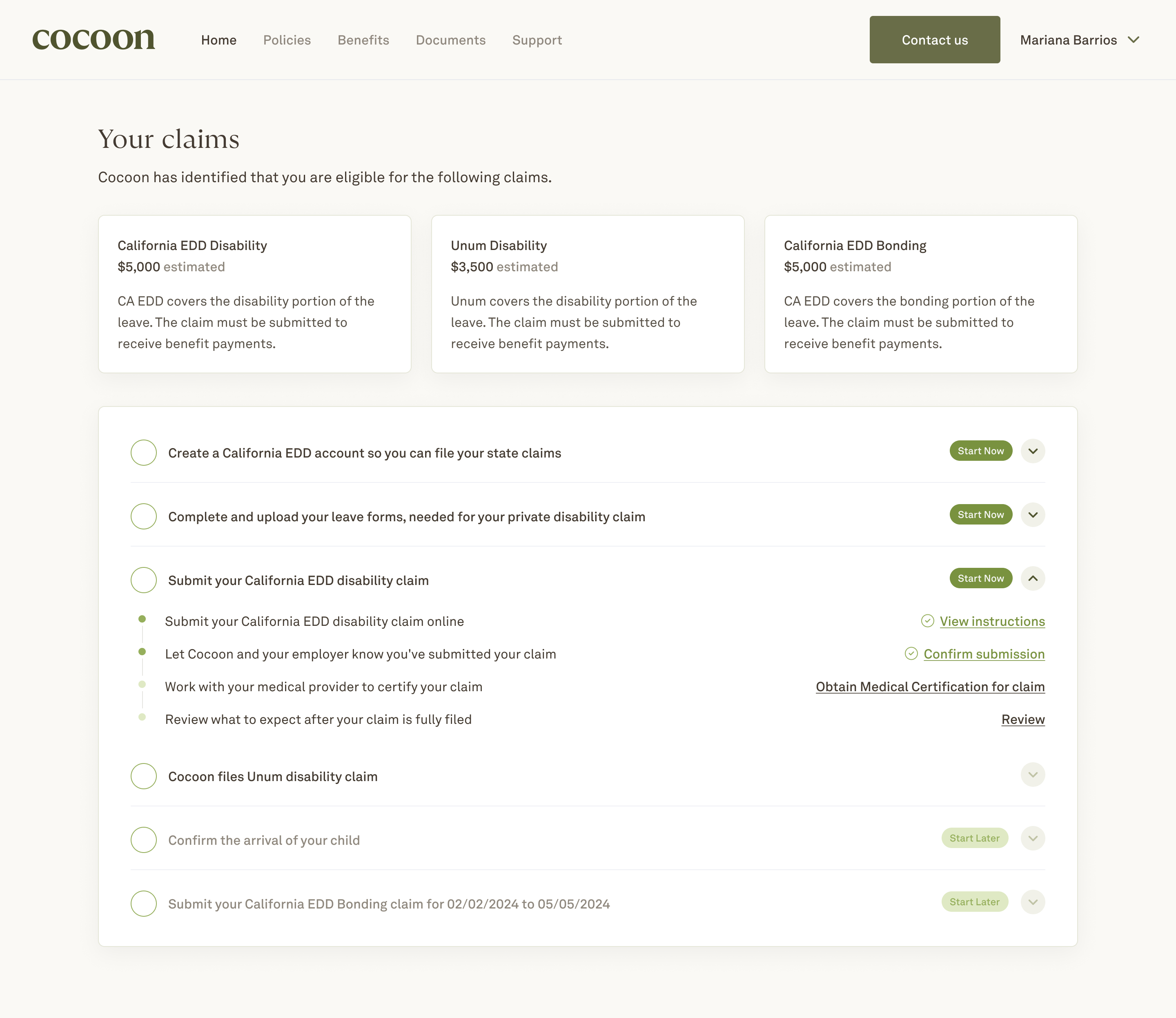 - Employer visibility: Because employees are logging all of their claims tasks and actions within their Cocoon dashboards, Cocoon Admins can click into any employee’s leave and see where they are in their claims task list, what’s been completed, and what’s coming up. That way if an employee runs into any issue, Cocoon gives Admins information at their fingertips to see what might have happened and help the employee troubleshoot. This enables Admins to become more helpful than ever before.