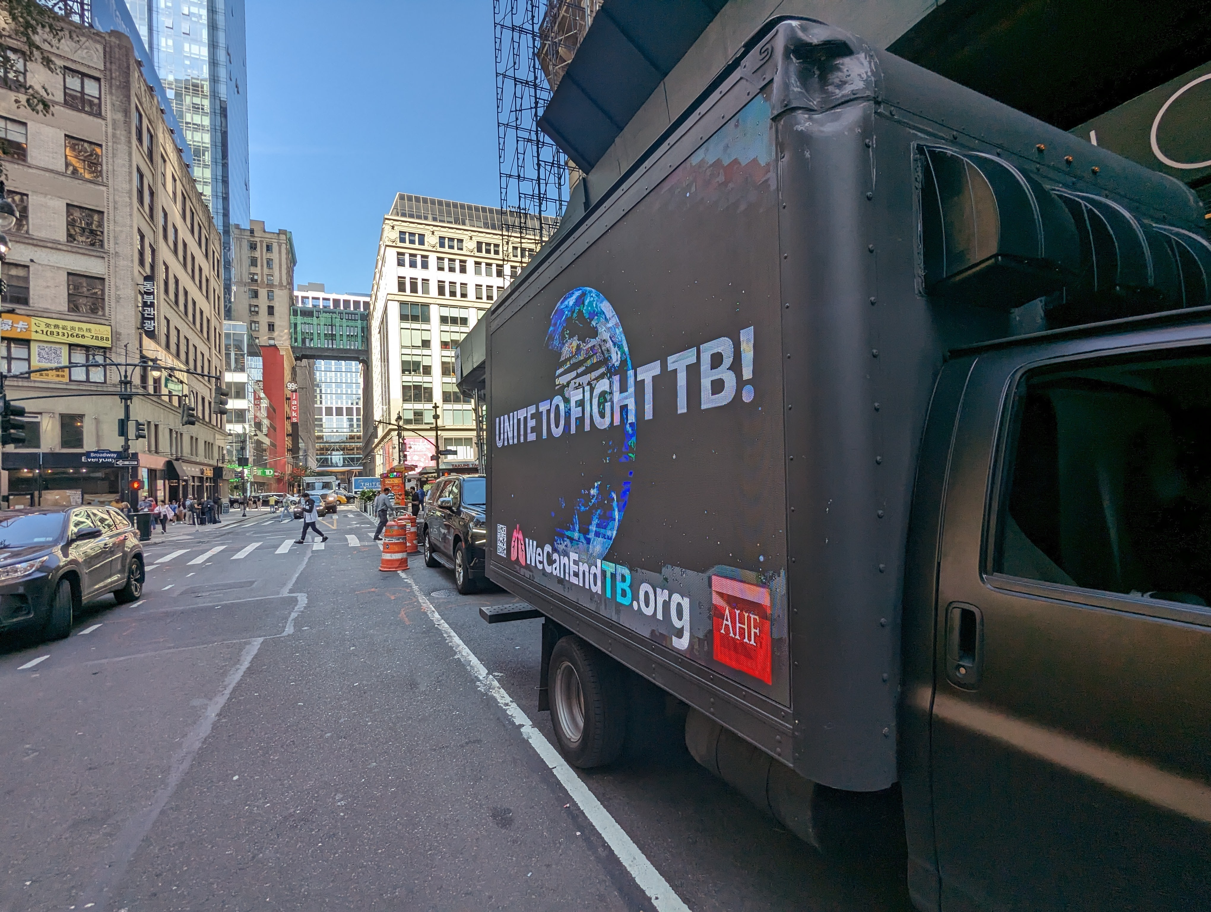 A mobile billboard in Manhattan with advocacy messages about tuberculosis. The AIDS Healthcare Foundation created a video comparing the number of annual TB deaths in 2022 to the population of Manhattan - both are approximately 1.6 million. The video was displayed on a mobile billboard that drove all week near the U.N. building Sep. 18-22 to catch the attention of U.N. General Assembly delegates. (Photo: Business Wire)