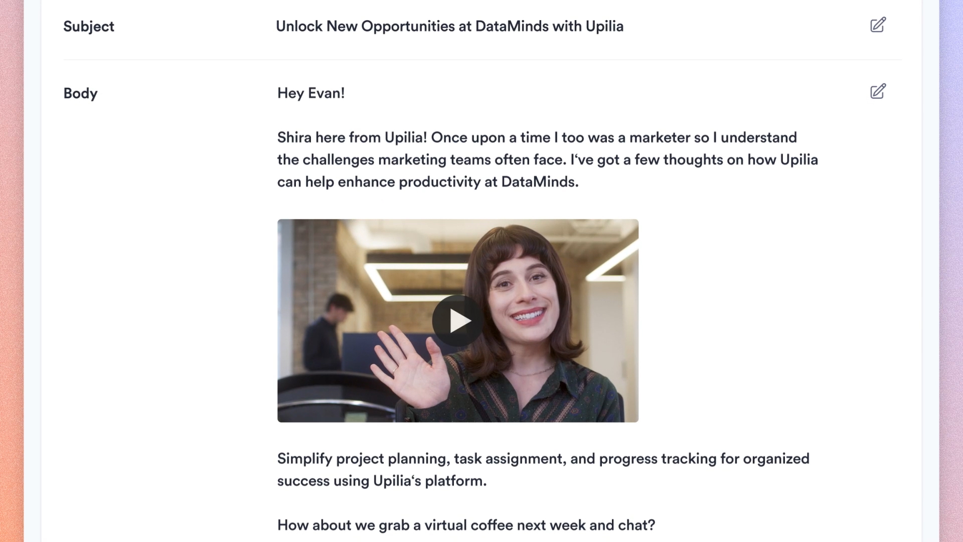 Unlike other contact data and outbound messaging tools, Vidyard Prospector fully automates the process of crafting and delivering hyper personalized emails for each lead with no customization or human intervention required. Going well beyond just adding the prospect’s name or title into the email, Vidyard Prospector uses generative AI to craft unique messaging for each lead tailored to their individual needs. To take messages from personalized to personal, it can also include a custom video message to stand out and make a more personal connection.
