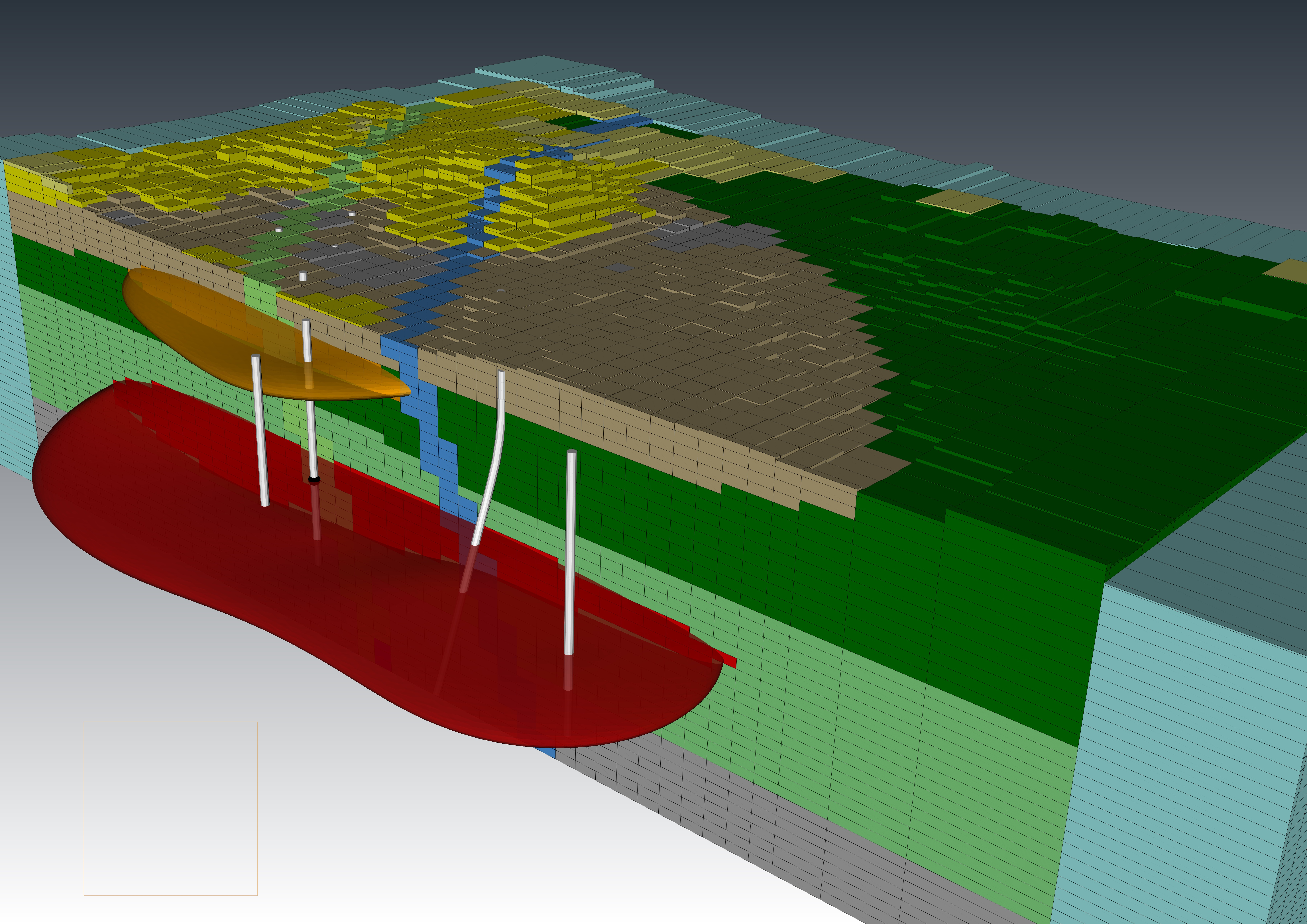Exemplo de modelo geológico construído no Leapfrog Energy sendo utilizado para simulação de reservatório no software Volsung, da Flow State Solutions. Imagem cortesia de Flow State Solutions.