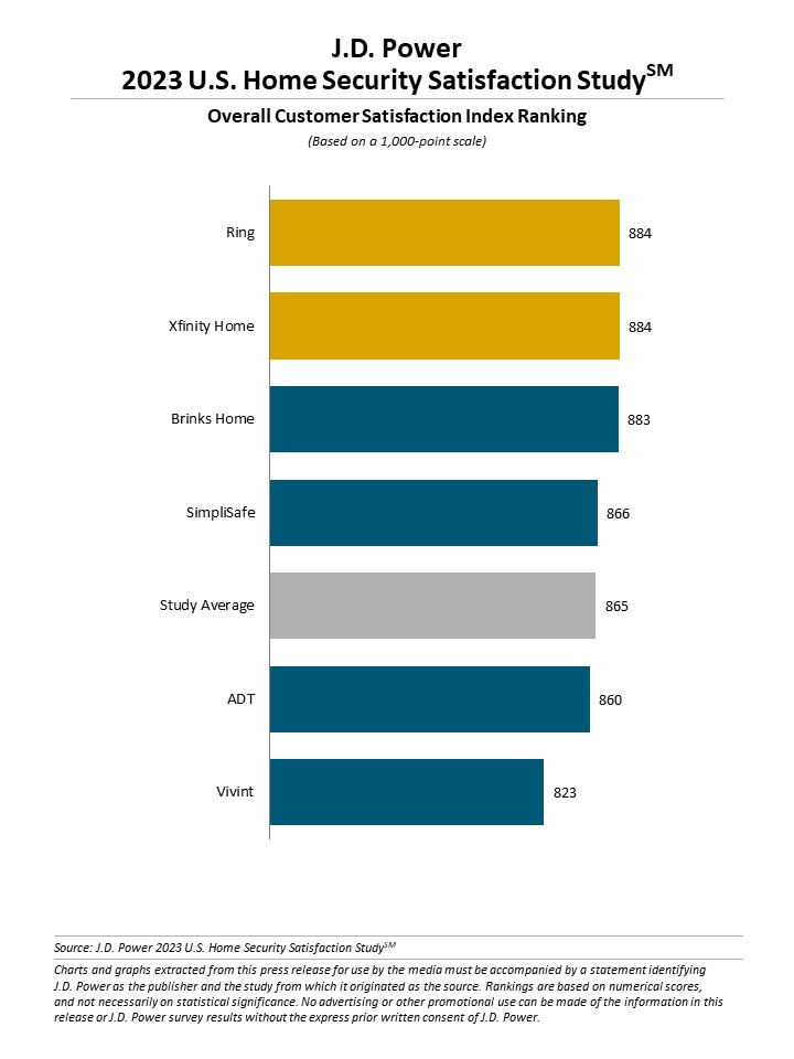 TROY, Mich.--(BUSINESS WIRE)--Overall customer satisfaction with home security systems rests high at 865 (on a 1,000-point scale), according to the J.D. Power 2023 U.S. Home Security Satisfaction Study,SM released today. Customers are especially satisfied with their purchase and installation experience, as systems have become easier to install, as well as their professional monitoring and customer service experience.