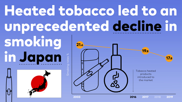 No Japão, a introdução de produtos de tabaco aquecido reduziu notavelmente as taxas de tabagismo entre homens para menos de 30% pela primeira vez, revertendo a estagnação anterior.
