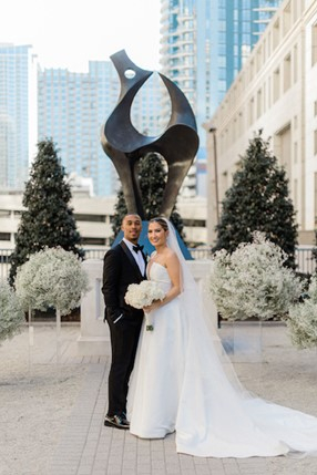 At Solomon Brothers, the couple found multiple bands that fulfilled their desires. Rebekah selected handcrafted, vintage-inspired bands adorned with oval-cut diamonds from A. JAFFE, while Damiere chose two classic and sleek white gold bands, also from A. JAFFE, to complement his minimalistic style. Rebekah expressed her gratitude, stating, "The customer service and beautiful showroom of Solomon Brothers, combined with the stunning quality and diverse designs of A. JAFFE, helped Damiere and me find wedding bands that we both love and will cherish for years to come."