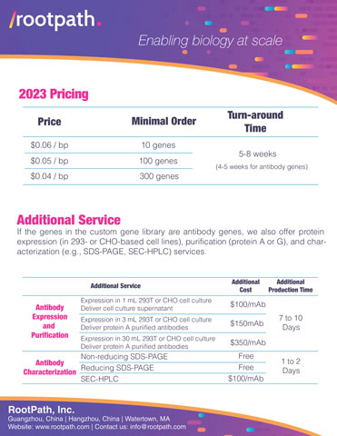 RootPath offers a range of plasmid vectors, including standard vectors like pUC19, pET-11a, as well as customer-provided ones. Currently, standard RootPath Custom Gene Library supports gene lengths from 450 bp to 2.5 kb. However, potential customers can inquire about longer genes up to 10 kb long. Additionally, for libraries of antibody genes, RootPath can also provide antibody protein expression, purification, and characterization services at competitive prices.