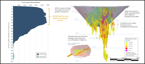 4) Cut-off grade defined by Gold Price, $1700/oz, Metallurgical Recovery 95%, Open Pit Mining Costs $2.9/t, Underground Mining Cost $29/t, Processing Cost $11.30/t, G&A, Rehabilitation & Closure $4.8/t, Royalty 0.75%. |