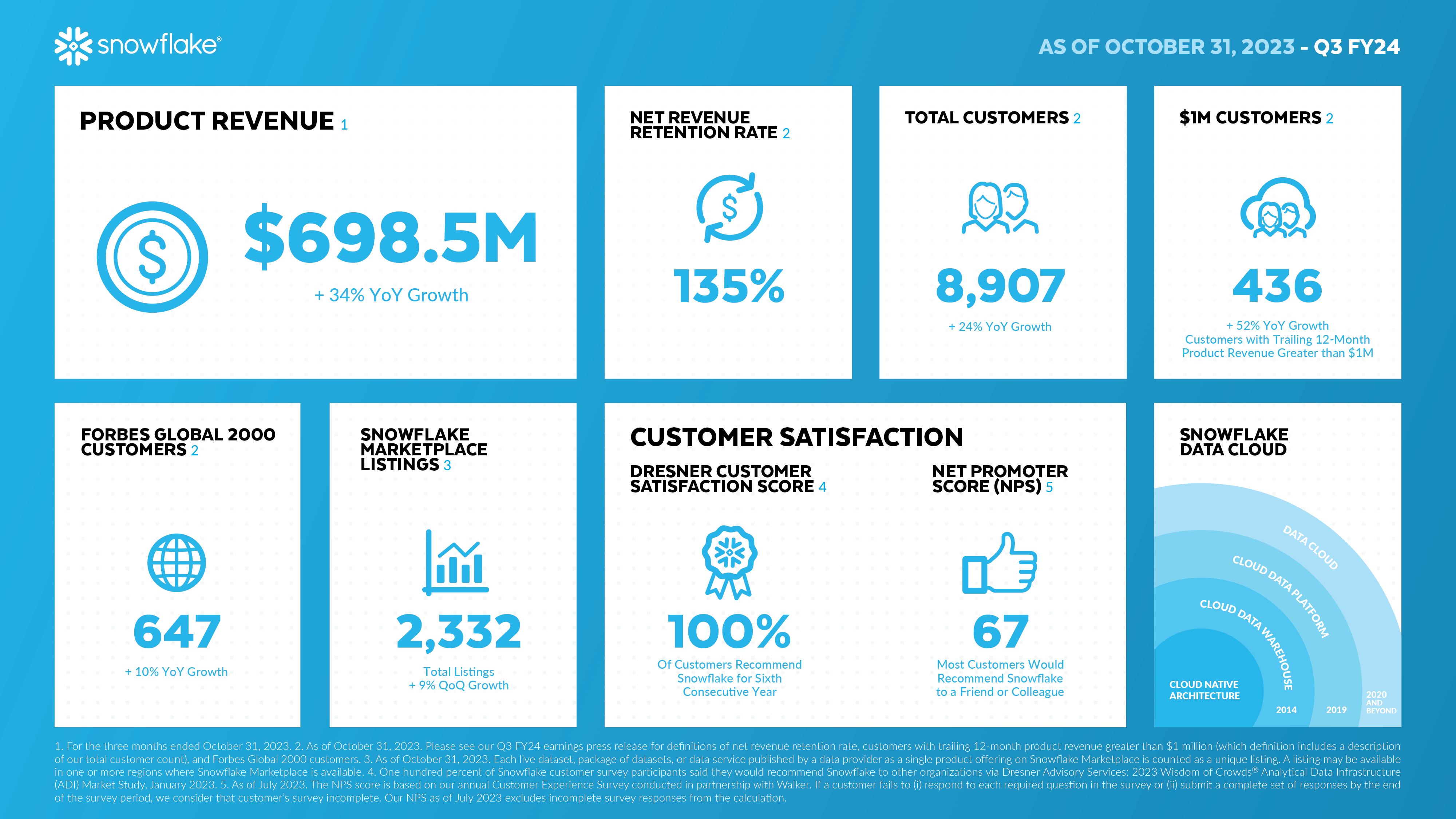 “During Q3, product revenue grew 34% year-over-year to reach $698 million and non-GAAP adjusted free cash flow was $111 million, representing 70% year-over-year growth. These results reflect strong execution in a broadly stabilizing macro environment," said Frank Slootman, Chairman and CEO, Snowflake.