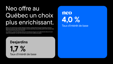 MONTRÉAL--(BUSINESS WIRE)--Neo Financial (Neo), un chef de file canadien en technologie financière, aide la clientèle du Québec à concrétiser ses objectifs d’épargne grâce à un nouveau taux d’intérêt élevé de 4 %² et à des outils numériques intelligents et interactifs pour faire fructifier son argent.