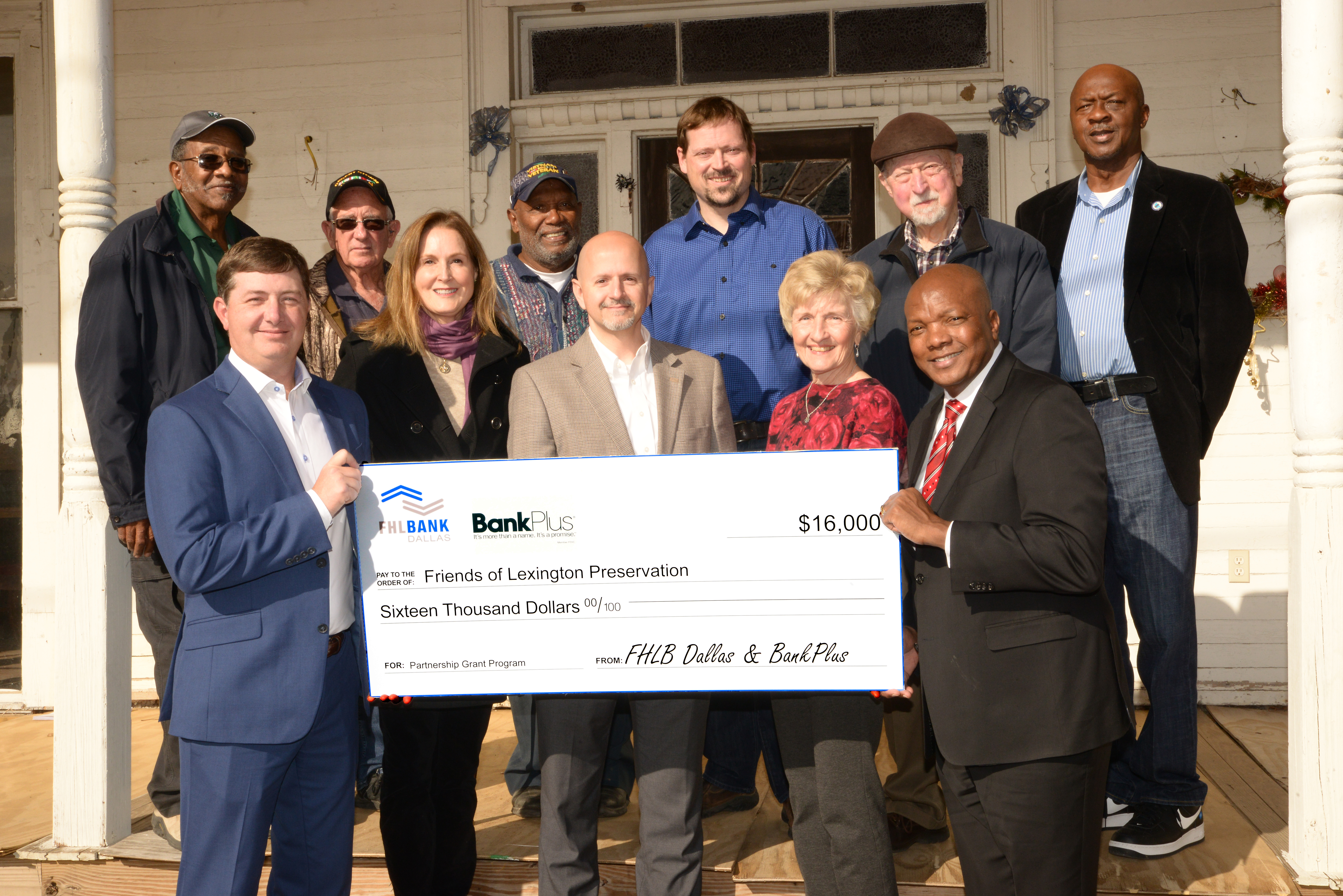 FHLB Dallas, BankPlus and Friends of Lexington Preservation celebrate a $16,000 award to revitalize the Lundy House. Front row: Ellis Harris III, Kathleen Hooker Waldrop, Mark Ouellette, Fran Thurmond and Bruce Hatton. Back row: Leroy Riley, Watt Ervin, Leonard Hampton, Landon Vollar, Phil Cohen and James Young. (Photo: Business Wire)