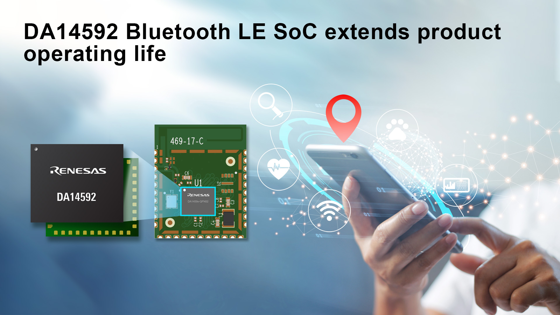 TOKYO--(BUSINESS WIRE)--Renesas Electronics Corporation (TSE: 6723), a premier supplier of advanced semiconductor solutions, today introduced the DA14592 Bluetooth® Low Energy (LE) System-on-Chip (SoC) representing Renesas’ lowest power consumption and smallest, multi-core (Cortex-M33, Cortex-M0+), Bluetooth LE device. By carefully balancing tradeoffs between on-chip memory (RAM/ROM/Flash) and SoC die size (for cost), the DA14592 is very well suited to a broad range of applications including connected medical, asset tracking, human interface devices, metering, PoS readers and ‘crowd-sourced location’ (CSL) tracking.