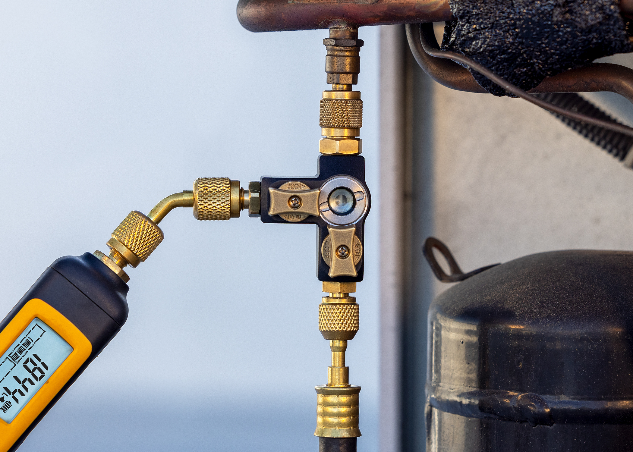 The premium VC2G tool features a dual ball valve design that protects attached vacuum gauges and pressure probes and adds versatility for connecting hose lines and isolating system service ports.