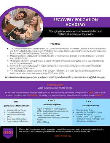 WORCESTER, Mass.--(BUSINESS WIRE)--Choices was formed with a mission to create a safe, supportive, and respectful recovery community where adolescents struggling with addiction and mental illness can reclaim and restore all aspects of their lives. We accomplished our mission by providing programs and services that enhance the behavioral health field and through quality youth-centered, comprehensive approaches to address the underlying and multiple unique challenges youth in recovery face daily. In our inaugural year, Choices was awarded a two-year grant of $1.1 million from the Massachusetts Executive Office of Health and Human Services to strengthen the mental health workforce pipeline through our Work Ready MA program that matches BA and MA level behavioral health students with active internships in partnership with local colleges.