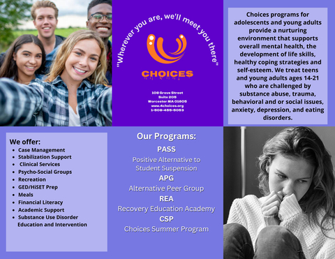 Choices serves Worcester County with collaborative partners across multiple disciplines. Our mission is to create a safe, supportive, and respectful recovery community where adolescents struggling with addiction and mental illness can reclaim and restore all aspects of their lives. Our year-round programs and services lead with recovery and address the critical areas of an adolescent’s life that are impacted – academics, peer support, youth development, leadership, and mental health. All programs are replications or innovations developed to improve how we help adolescents and create positive change in their lives. We aim to be fully inclusive reaching children and families from all socioeconomic groups, races, culture, and religions.