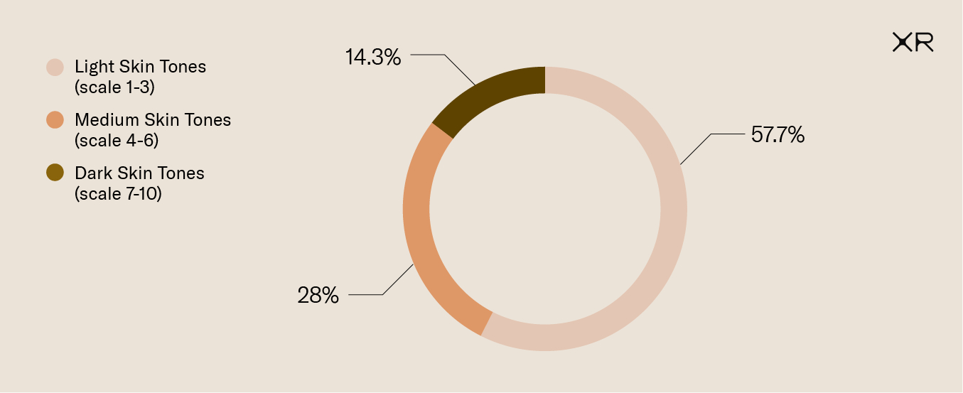 Skin Tone: In recent years Super Bowl ads featured more people of color compared to the industry average. This year XR used the Monk Skin Tone Scale as it is a more inclusive 10-tone scale explicitly designed to represent a broader range of communities. People with lighter skin tones represented nearly 60% of all featured talent, double those that fell into the Medium skin tone scale.