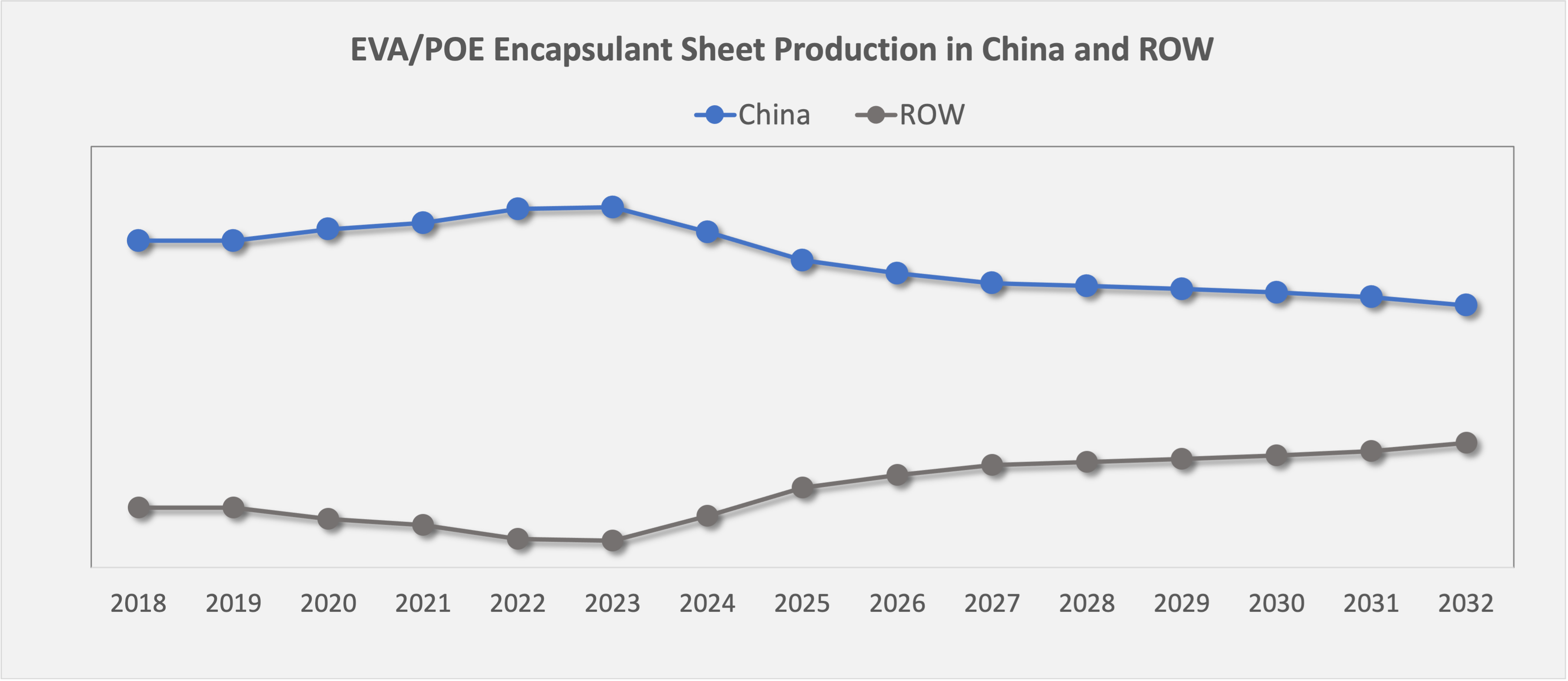 Another key finding of the Global EVA/POE Solar Module Encapsulant Sheet Market—2024 is the forecast globalization of encapsulant sheet production due to regional and national initiatives such as the U.S. Inflation Reduction Act (IRA) and local content requirements in India, as well trade-related barriers such as anti-dumping duties implemented in Europe and elsewhere. The share of sheet production outside of China is estimated to reach almost 35% by 2032 in the base case derived from MLTA market modeling.