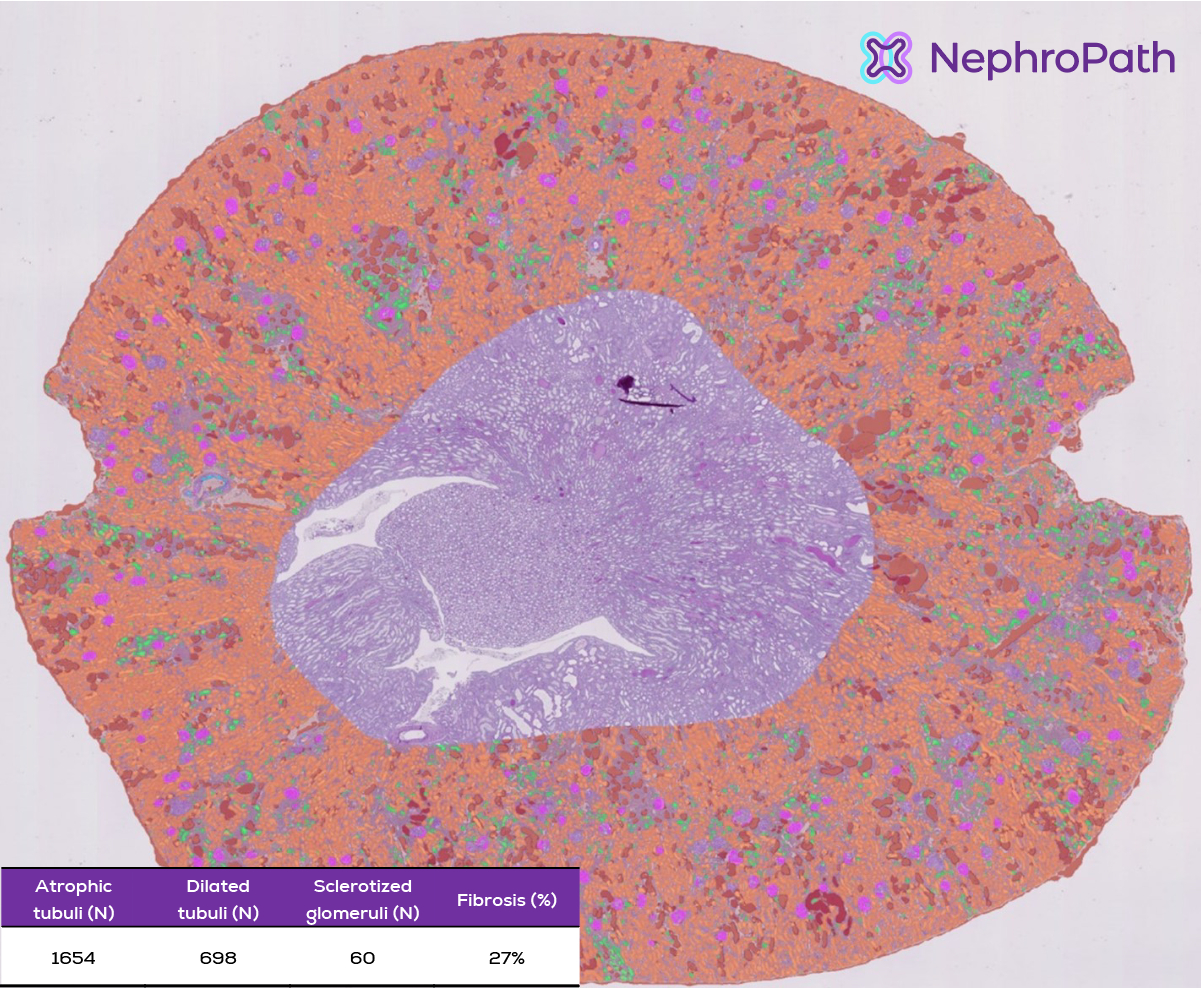 La plataforma NephroPath ofrece algoritmos de patología computarizados para una evaluación detallada de los biomarcadores histológicos en biopsias renales, incluida la segmentación de los principales tipos de tejidos, la cuantificación de fibrosis intersticiales, la cuantificación y la localización precisa de glomérulos y mucho más.