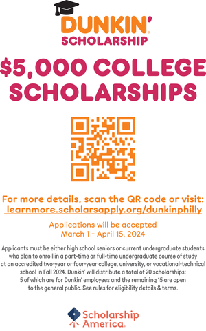 Applications for the fifteenth annual Dunkin’ Philadelphia Regional Scholarship Program will be accepted through April 15. Applicants must be either high school seniors or current undergraduate students who plan to enroll in a part-time or full-time undergraduate course of study at an accredited two-year or four-year college, university, or vocational-technical school in Fall 2024. Applicants must reside and/or be currently enrolled in college in Southeastern Pa., Southern N.J., or Kent and New Castle counties Del. to be considered. For more information or to apply, visit https://learnmore.scholarsapply.org/dunkinphilly/.