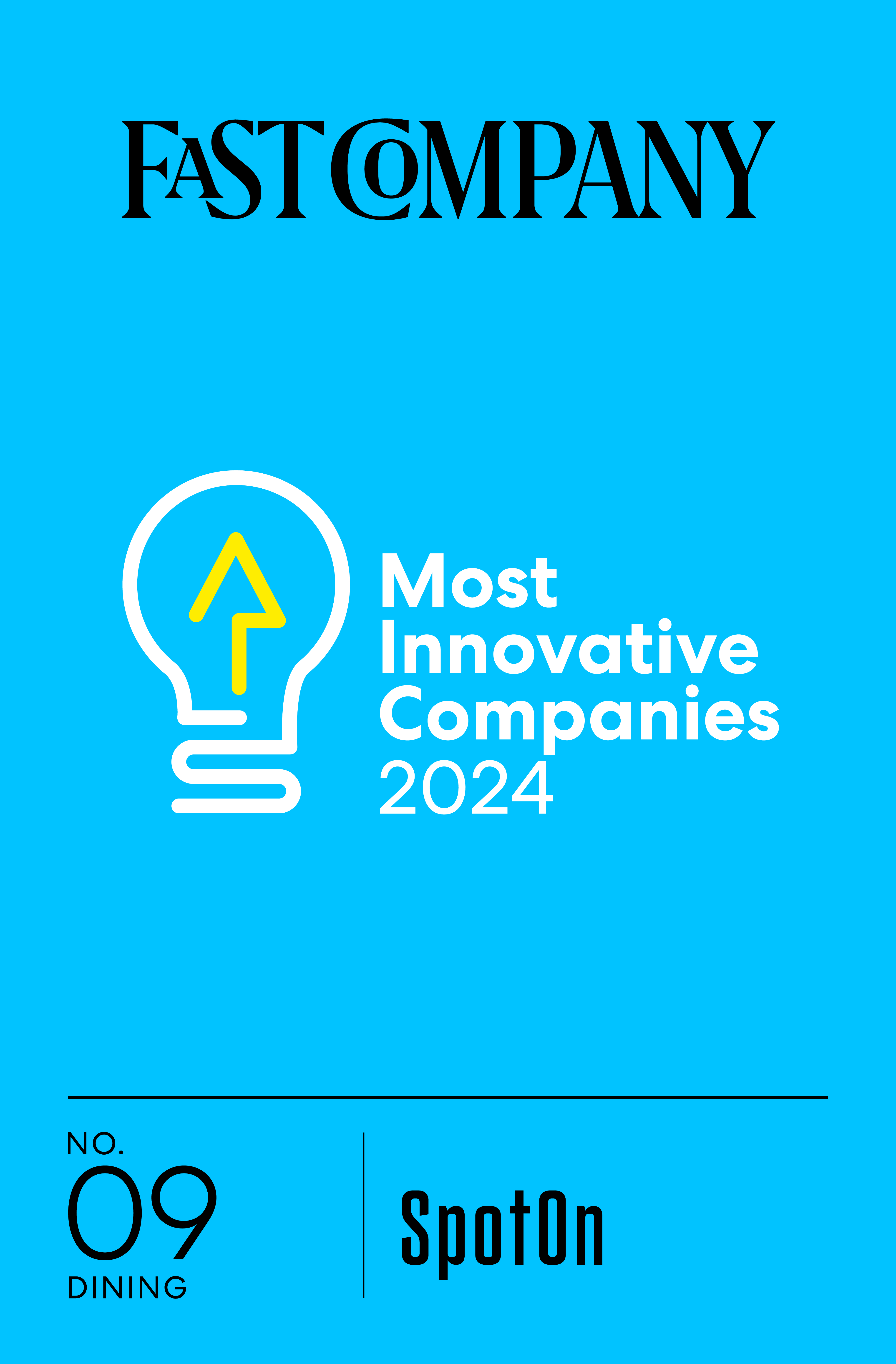 SAN FRANCISCO--(BUSINESS WIRE)--SpotOn, the top-rated software and payments partner for restaurants and small businesses, has been named to Fast Company’s prestigious list of the Most Innovative Companies for 2024. SpotOn earned the standing of number 9 in the Dining category, which recognizes companies driving the restaurant industry forward through technology.