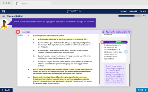 At the end of each exercise, learners receive feedback detailing why their choices were or were not correct. This allows them to see firsthand the common mistakes made when working with contracts, as well as the reasons those mistakes should be avoided. By walking through these exercises with that feedback, learners are better prepared to approach real-world contracts with confidence.