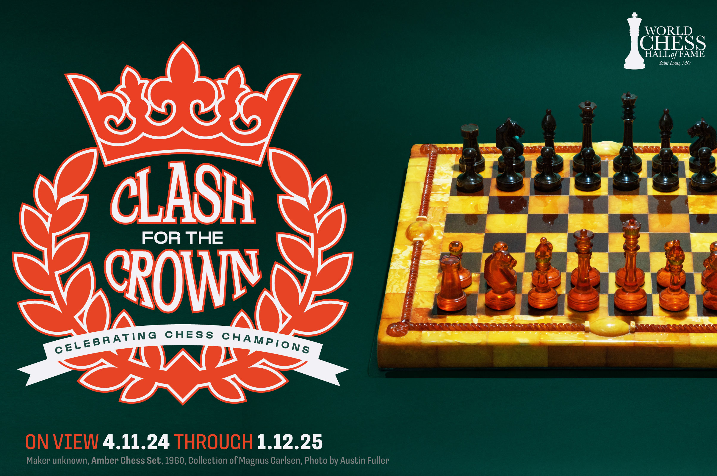 “Clash for the Crown: Celebrating Chess Champions” explores the histories of the World Chess Championship and Women’s World Chess Championship through a display of artifacts from the collection of the WCHOF, FIDE and loans from world chess champions including World’s No. 1 Magnus Carlsen and private lenders.