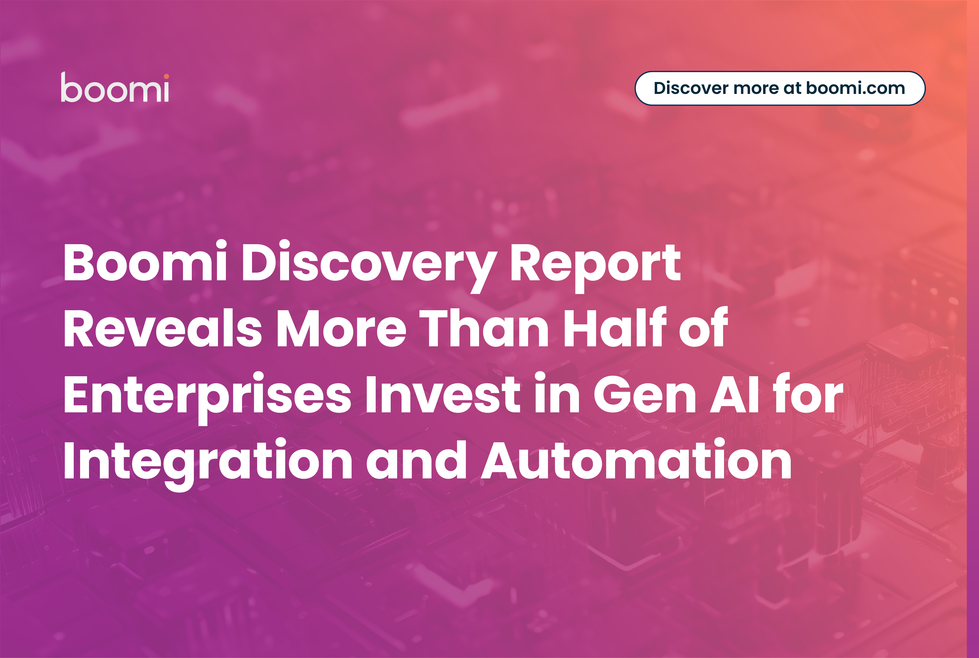 CONSHOHOCKEN, Pennsylvania--(BUSINESS WIRE)--Boomi™, leader nello sviluppo di soluzioni per l’automazione e l’integrazione intelligenti, oggi ha annunciato i risultati del suo Boomi Discovery Report, commissionato da 451 Research1. Il report, basato sui punti di vista di 650 aziende e leader IT in una vasta gamma di settori, illustra come le aziende stiano usando l’IA generativa per integrare sistemi e automatizzare procedure e come da ciò siano derivati miglioramenti nelle loro operazioni.