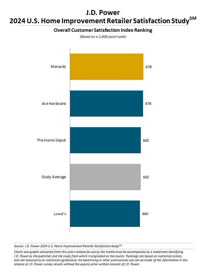 Menard’s ranks highest in customer satisfaction with a score of 678. Ace Hardware (676) ranks second and Home Depot (665) ranks third.
