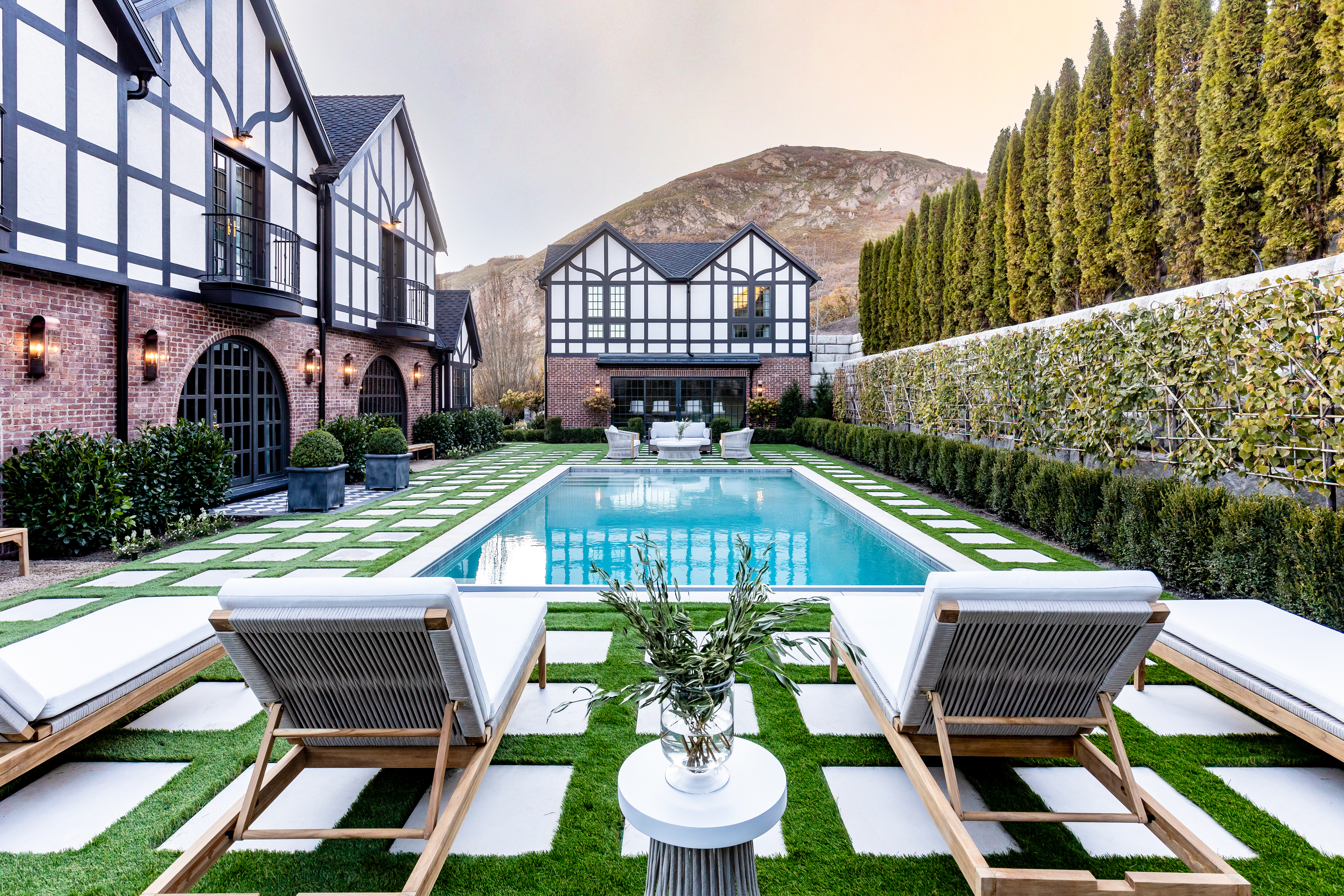 While not typically English, the home features an incredible poolscape designed with coping from Belgard, as well as Glocal porcelain pavers laid into the surrounding turf.