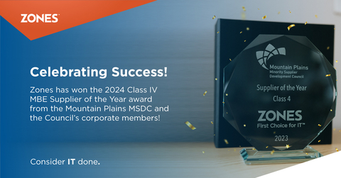 AUBURN, Wash.--(BUSINESS WIRE)--Zones, a global solution provider renowned for its comprehensive IT services and solutions, is thrilled to announce that it has been awarded the prestigious 2023 Class IV Supplier of the Year Award by the Mountain Plains Minority Supplier Development Council (MPMSDC). This top accolade recognizes Zones as the best among the largest class of Minority Business Enterprises (MBEs), highlighting our exceptional performance, innovative solutions, and steadfast commitment to supplier diversity.